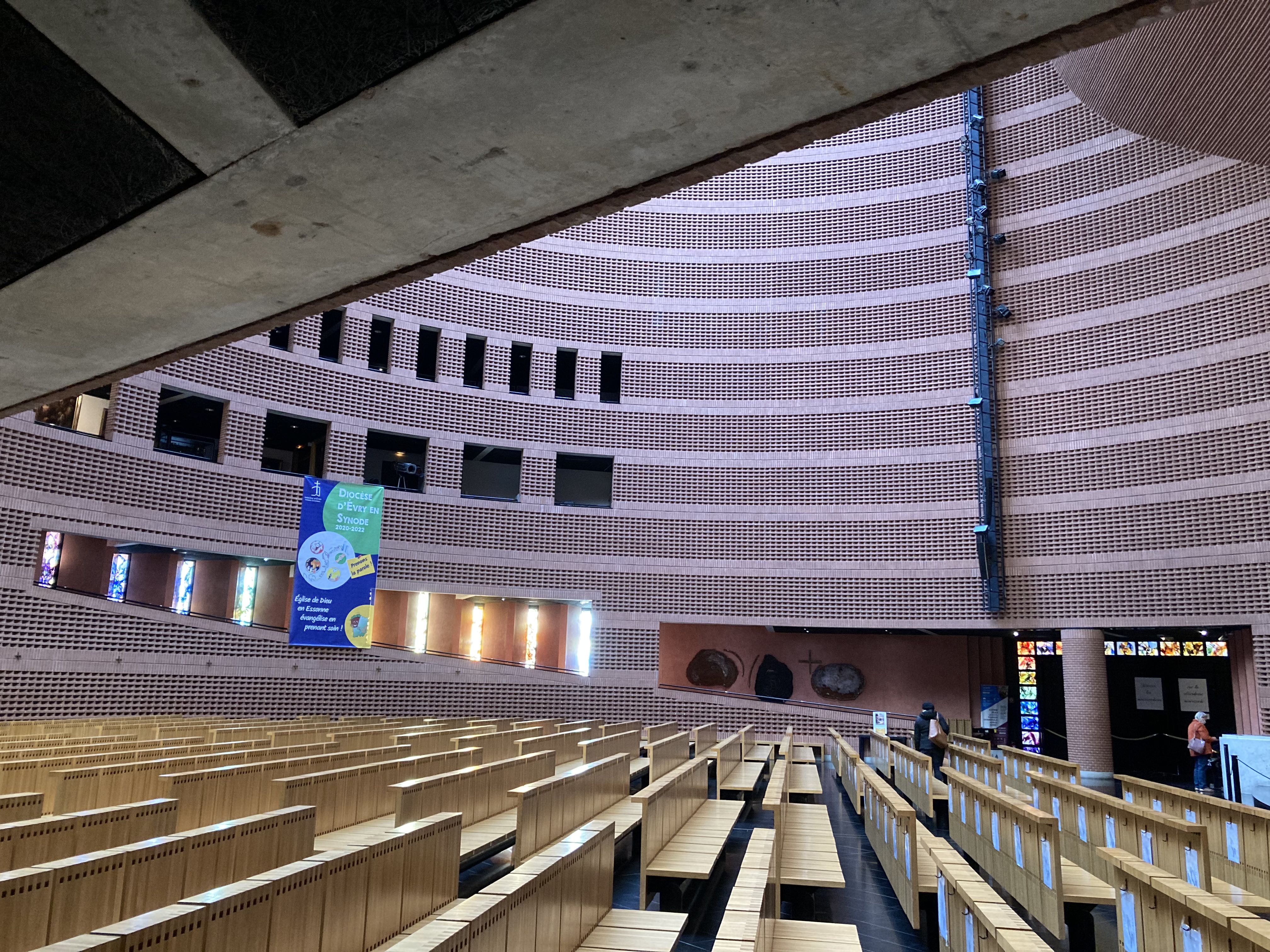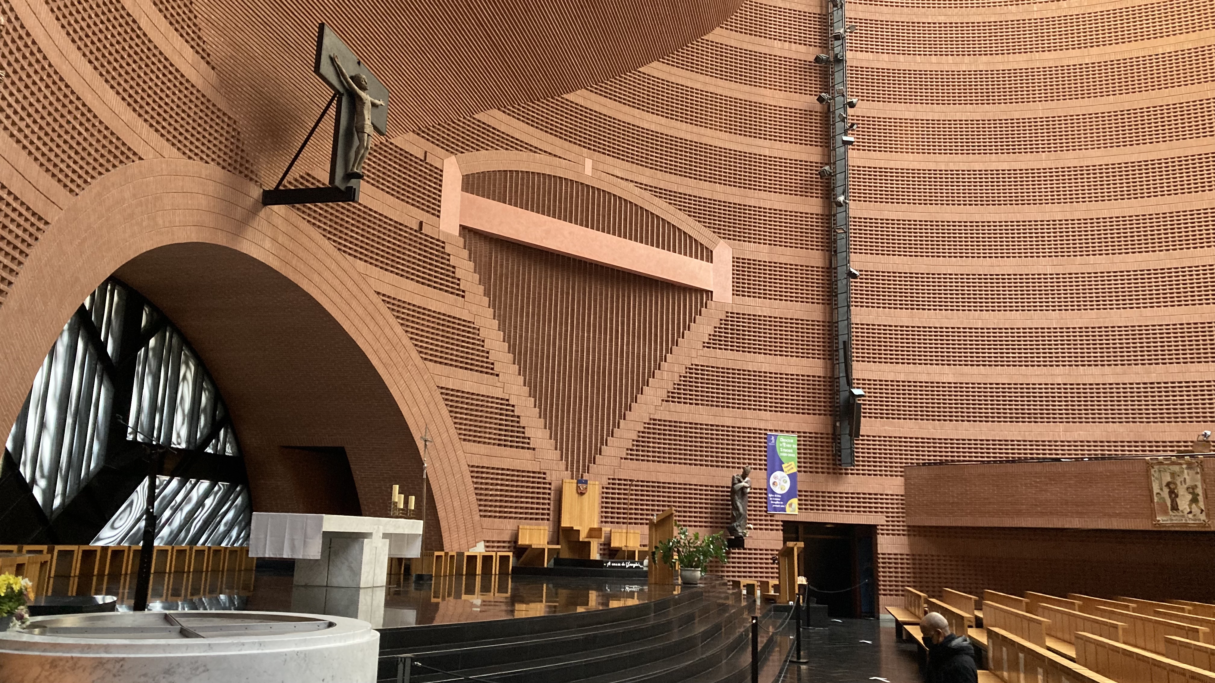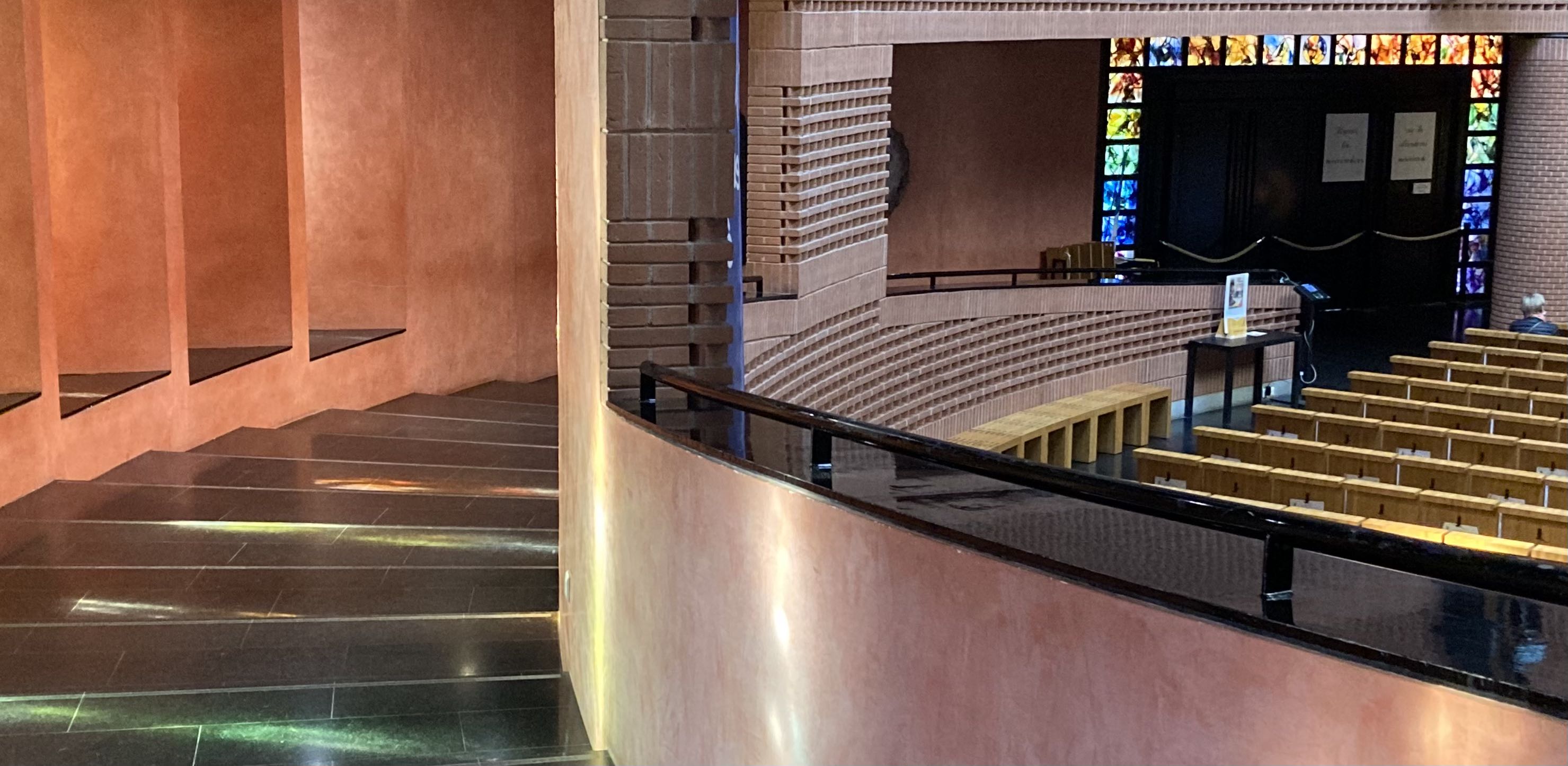 Au milieu d’un après-midi ensoleillé de novembre, la légère descente vers la grande nef est saisissante, comme si la lumière spirituelle de l’invisible qui se reflète sur le marbre noir compensait pour le fidèle en marche l’austérité de la brique.