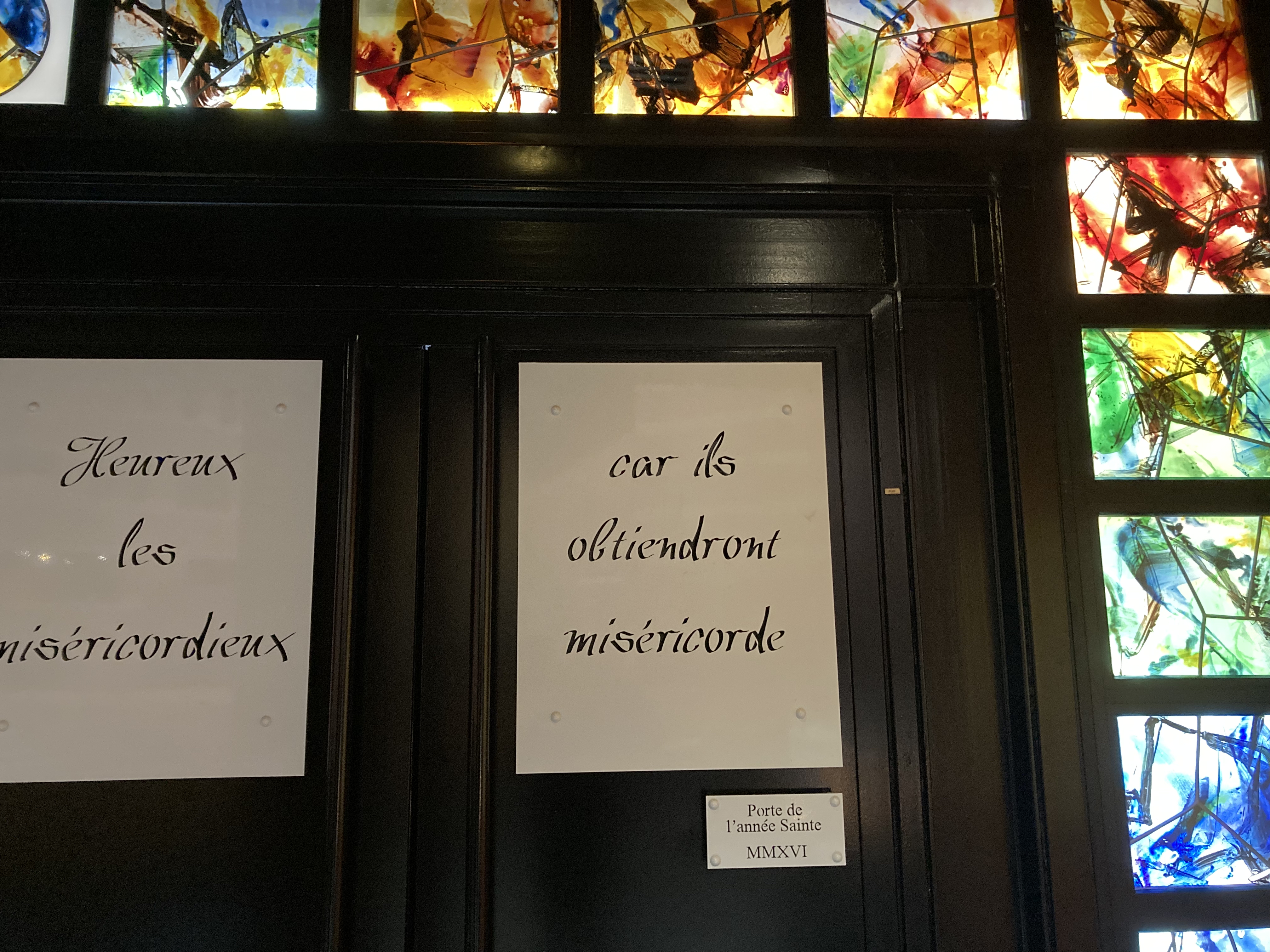 Les vitraux légèrement rectangulaires de la Porte Sainte ramènent le fidèle dans plus de densité et de plénitude avant de pénétrer dans la nef devant le Christ crucifié. Ces vingt-cinq emplacements suggèrent l’épisode des vingt-quatre vieillards de l’Apocalypse entourant l’agneau mystique couché sur un arc-en-ciel. Kim rend hommage à ces vingt-quatre Vieillards qui intercèdent pour nous auprès de Dieu : une invitation pour les fidèles à devenir aussi des veilleurs !
