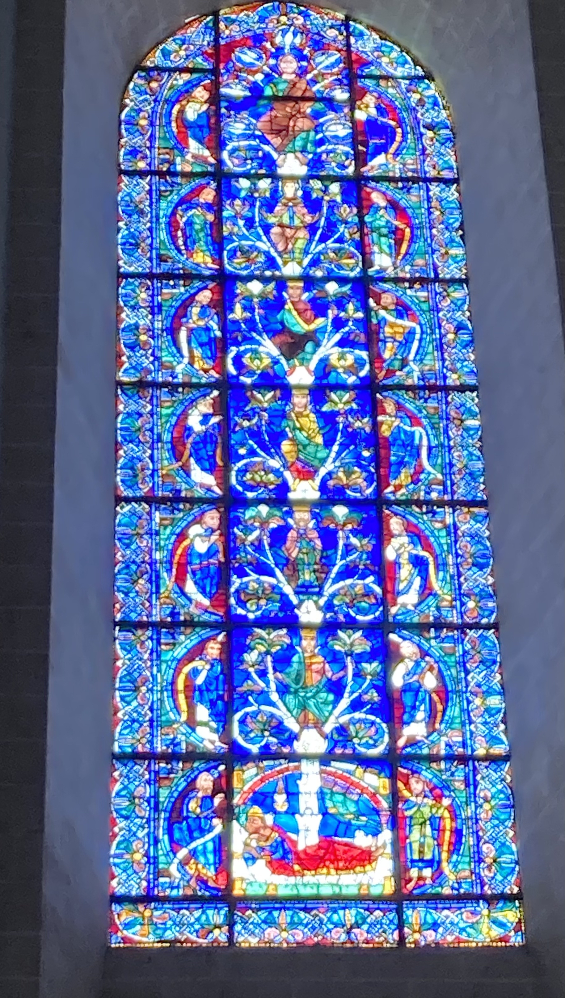 Ici, le geste quasiment calligraphique des traits-branches relie entre elles dans un mouvement ascensionnel les surfaces colorées. Est-ce un rappel de l’arbre de Jessé (visible ci-dessous), le plus célèbre vitrail de Chartres ? Les grands blancs font alterner le vide et le plein, la nudité et la plénitude, l’absence et la présence, la joie d’une rencontre et de retrouvailles comme nous le suggérons plus loin avec François Chen. Nicolas Jean Sed l’écrit bien : « Dans la calligraphie, le corps est transfiguré, il est âme. La calligraphie est l’art du trait, l’art de l’amitié, le trait d’union entre les êtres humains et le divin. »