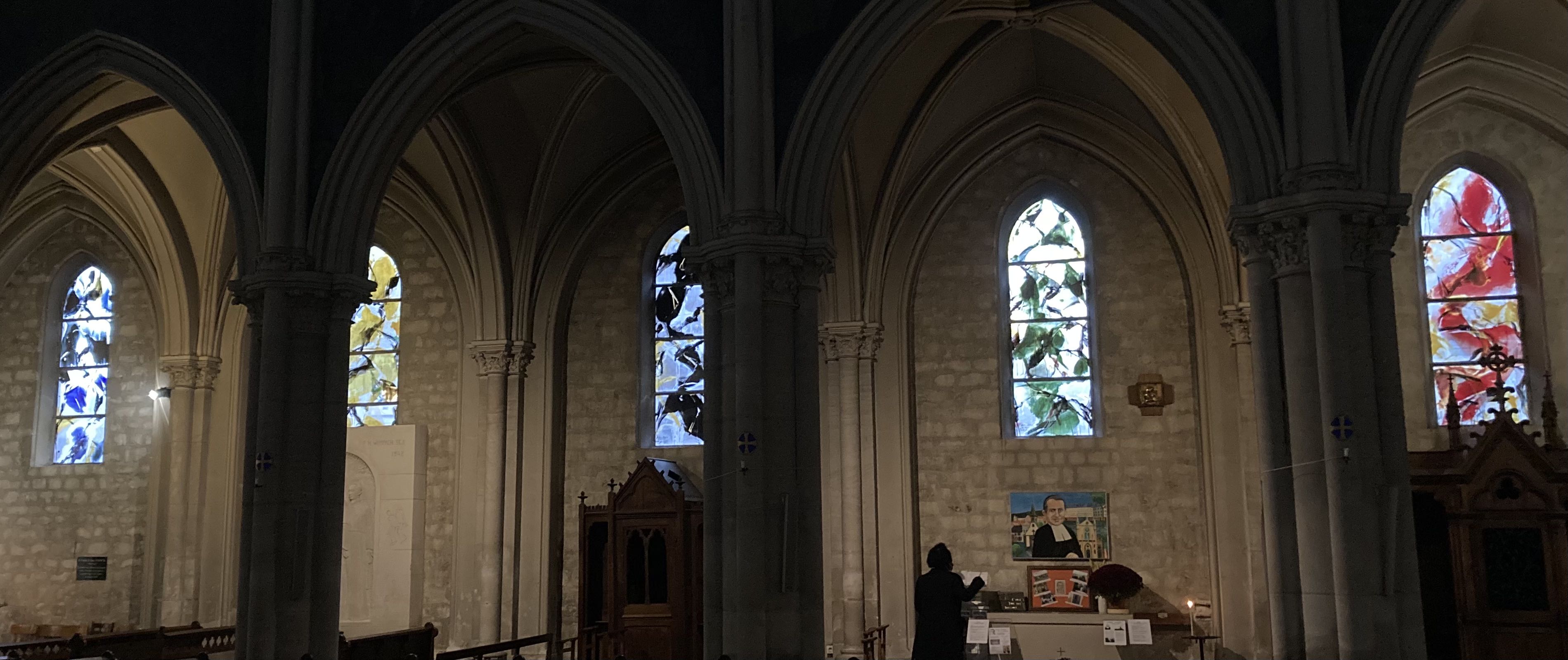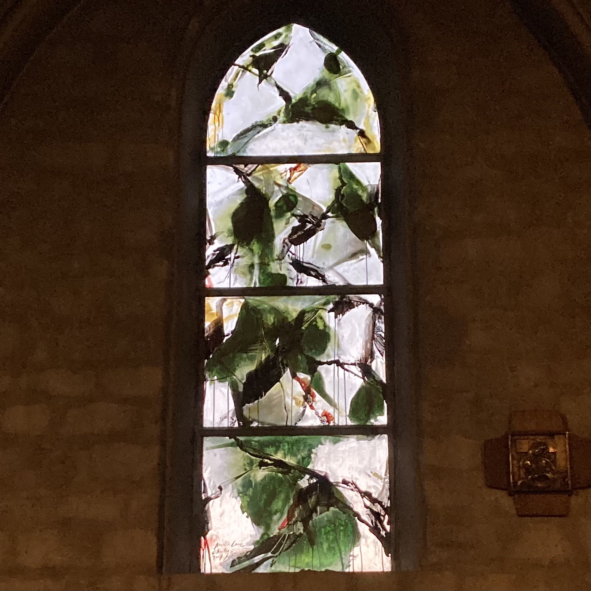 La structure en quatre parties de chaque vitrail et les tonalités différenciées, avec chaque fois une couleur dominante à valeur symbolique (bleu-espérance/pureté, jaune-Résurrection/joie, noir-mort, vert-paix/persévérance et rouge-Passion/Esprit saint) imposent une majesté sereine à cette petite église néo-gothique de quartier, qui fut un temps l’église parisienne de la mission allemande. Le mouvement de l’oeil est ascendant et le poème de François Chen dédié à Kim En Joong peut être ici révélateur d’une approche poétique possible de ces images.