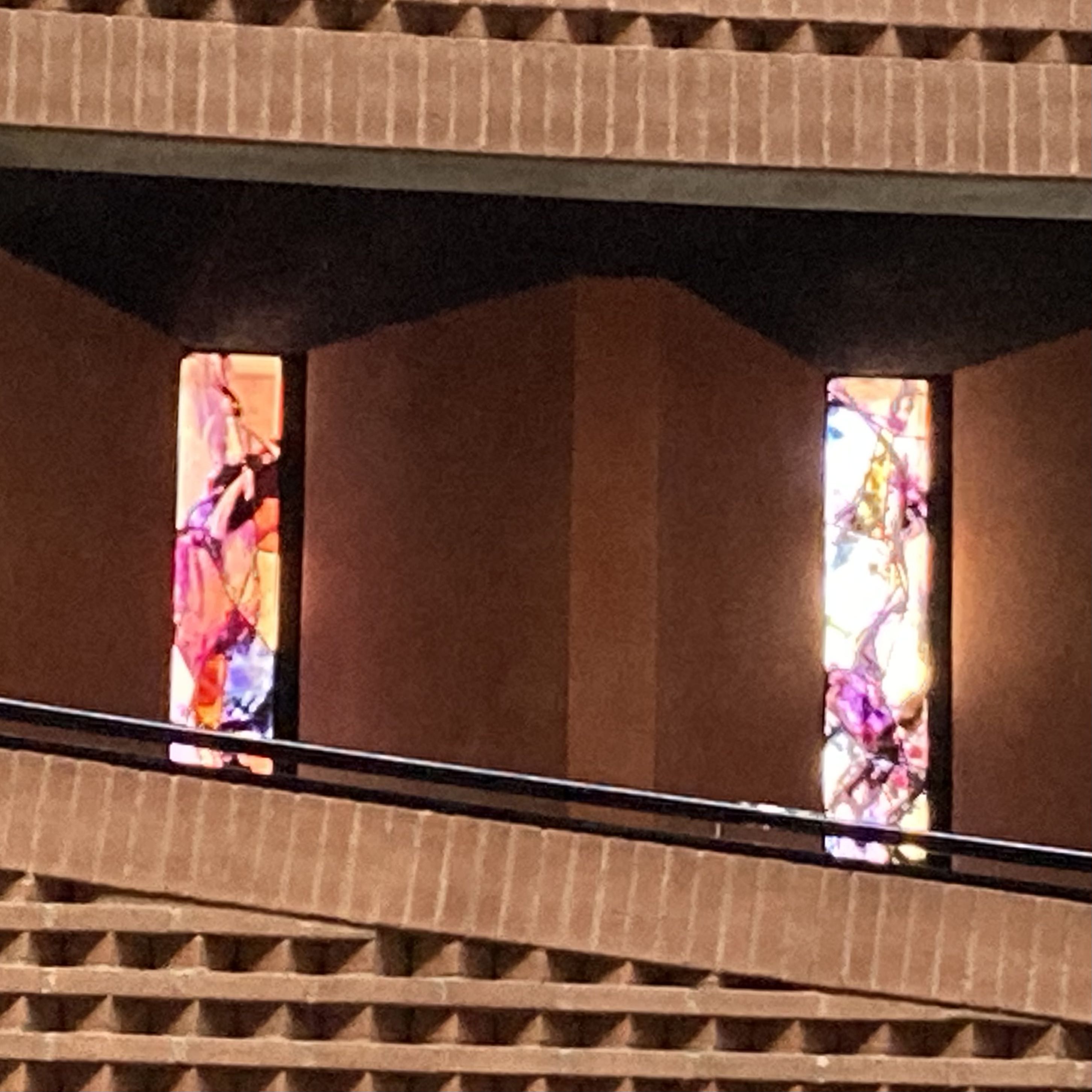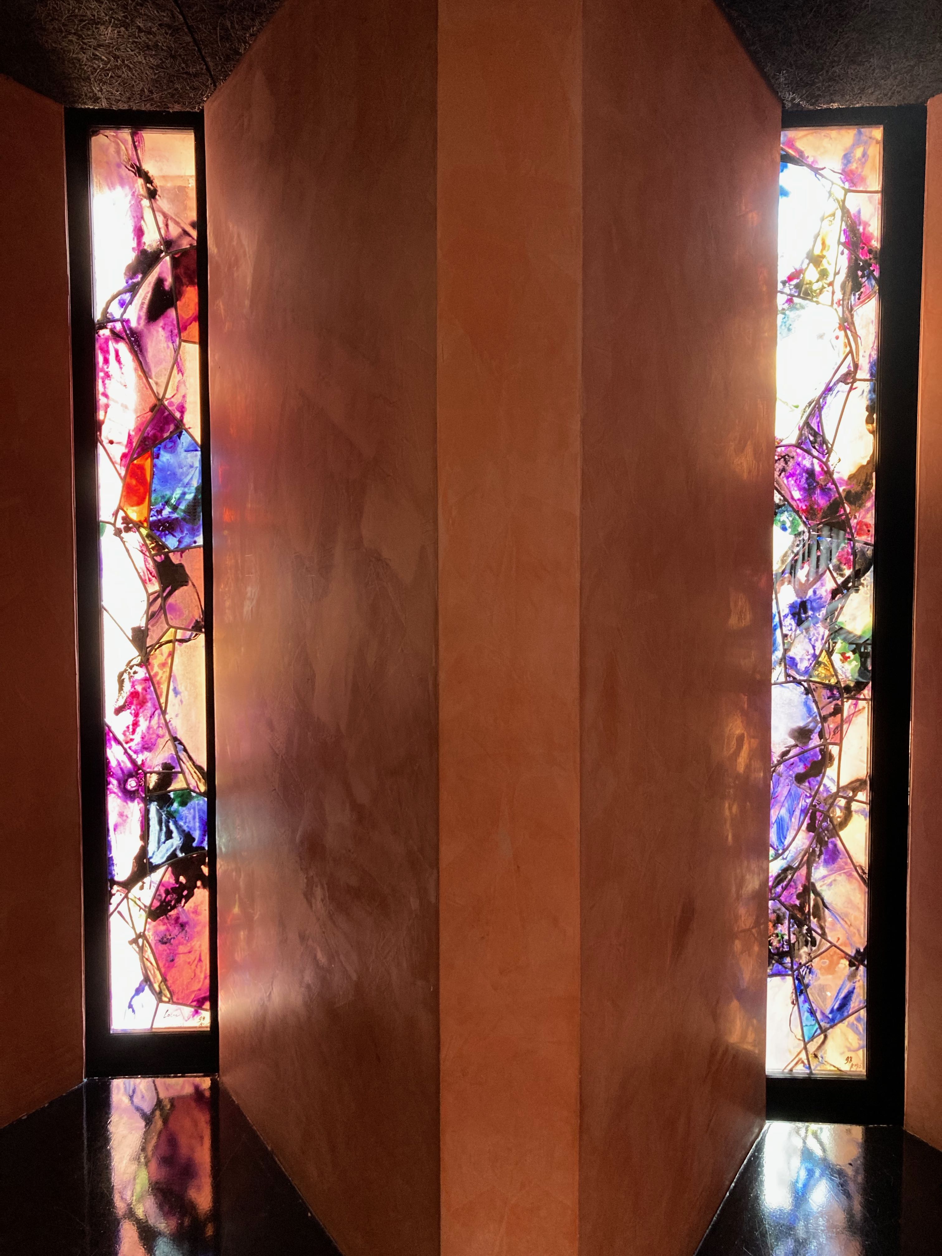 Dans le couloir, Kim utilise un geste plus tourmenté, avec des ruptures et des brisures, des carrefours et des impasses. Les douze vitraux évoqueraient-ils des stations de la Passion du Christ ? Kim pensait plutôt aux douze apôtres fondateurs de l’Église.