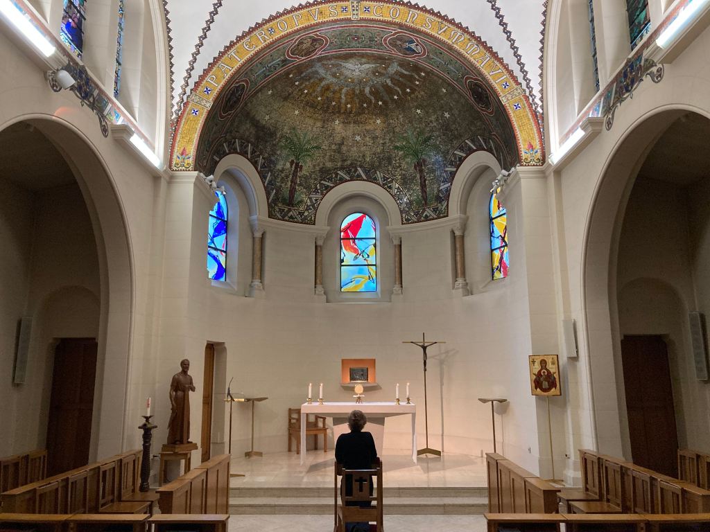 La chapelle des Franciscaines Réparatrices de Jésus-Hostie se situe avenue de Villiers, à l’ouest du XVIIe arrondissement, près de la Porte Champerret. Aujourd’hui, une trentaine de sœurs vivent dans ce couvent où le Père Kim célèbre encore la messe. La maison Jésus-Hostie ouvre ses portes toute la journée; une sœur à l’accueil nous indique la chapelle. On se recueille dans ce havre de paix au cœur de l’agitation parisienne car le Saint Sacrement y est exposé toute la journée, depuis la fin de la messe le matin, jusqu’à la fin des vêpres. Les sœurs se relaient toutes les demi-heures au prie-Dieu.