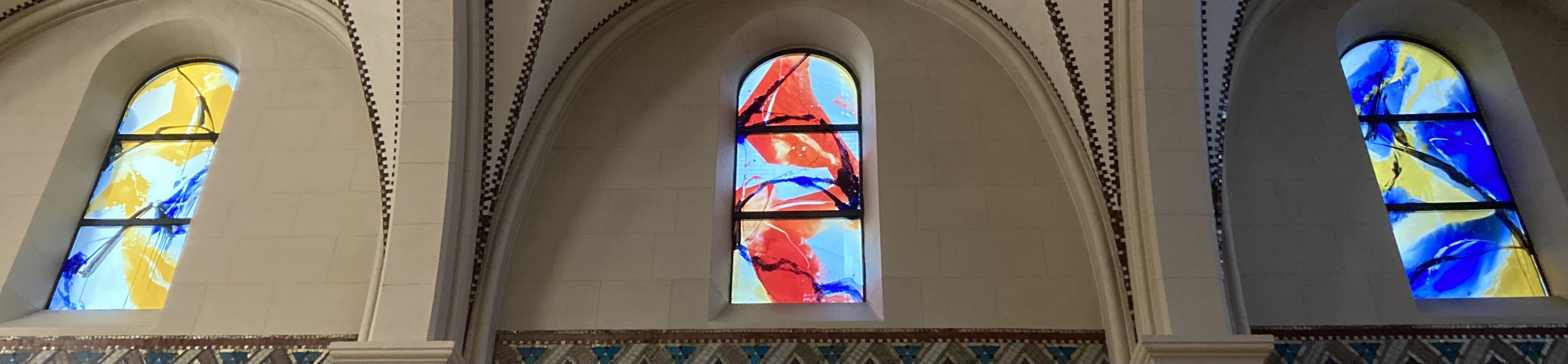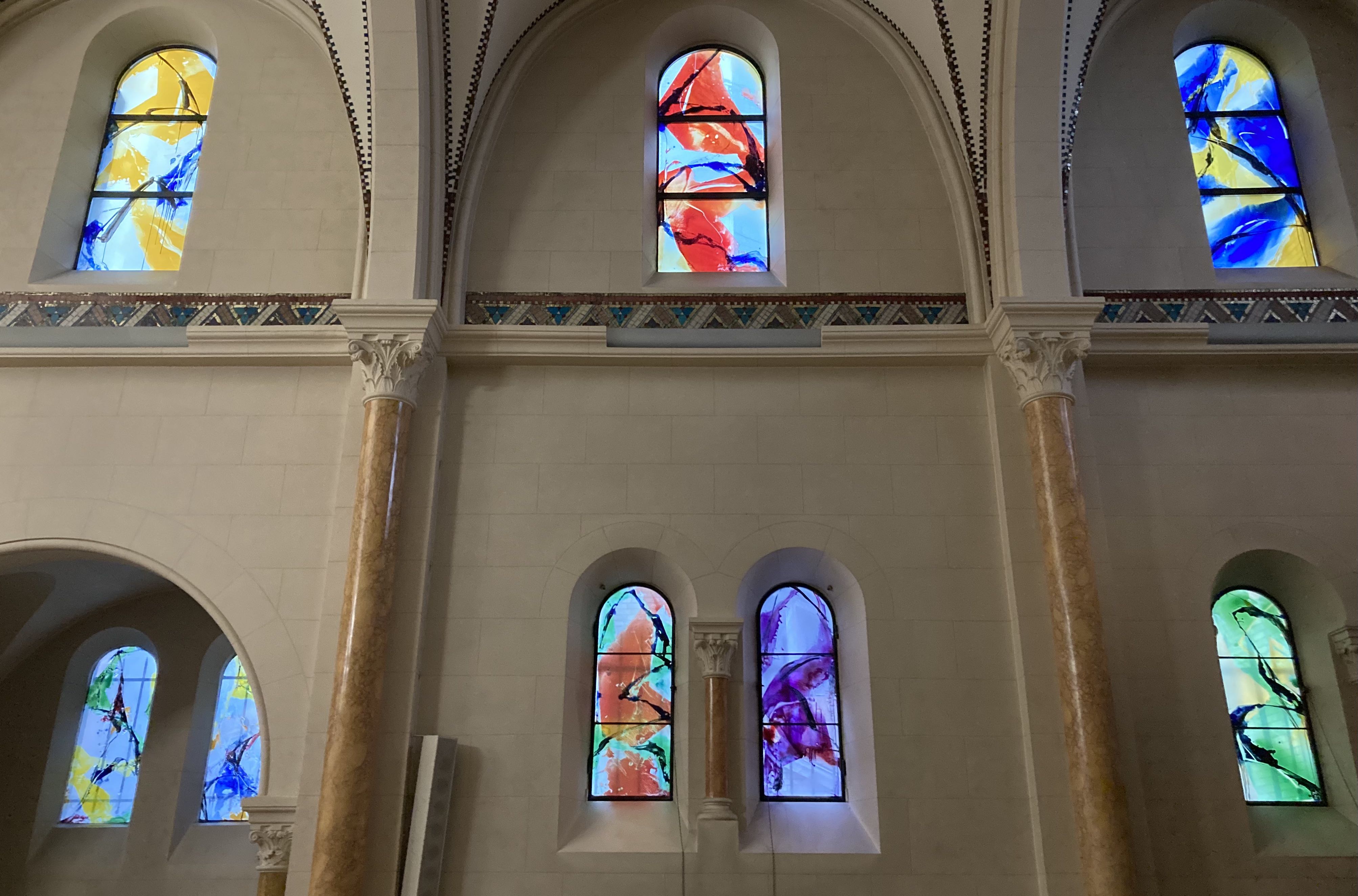 Dans la cathédrale de la Résurrection à Evry, les vitraux du Père ont un rôle architectural et spirituel considérable. Ils constituent les seules traces de couleurs autour de l’uniformité de la brique choisie par l’architecte Maria Botta. Pour accéder au lieu de culte, les fidèles prennent une rampe douce incurvée à droite de l’entrée. Ils vont s’asseoir dans la nef en passant devant la Porte de l’année sainte avec ses vingt-quatre vitraux évoquant les vingt-quatre vieillards de l’Apocalypse. Leur parcours est rythmé : d’abord par les douze vitraux très verticaux en enfilade de la façade ouest; puis par la lumière de la porte entourée des vingt-quatre vitraux.