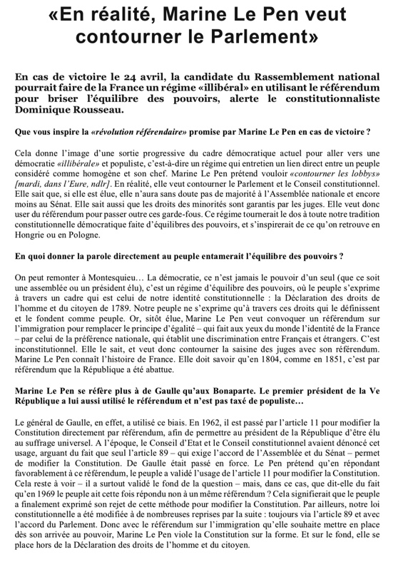 Le 14 avril, après le 1er tour de l’élection, le constitutionnaliste Dominique Rousseau montre que la fascisme de Le Pen doit passer par l’instauration d’une démocratie illibérale comme en Hongrie.