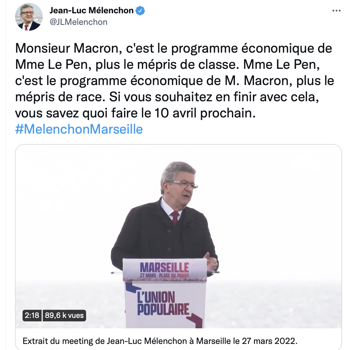 L’exemple emblématique de cette position est l’ancien député socialiste neuchâtelois Matthieu Béguelin, qui est aussi un électeur français partisan de Jean-Luc Mélenchon. Pour lui, « Marine Le Pen est dédiabolisée car à l’exception de certaines mesures comme la préférence nationale, son programme est déjà en place et les instruments de contrôle et de répression dont elle aurait pu rêver également ». Autrement dit, Macron a fait la politique de Le Pen ces cinq dernières années. Or, la mesure-clé de vote de la candidate néo-fasciste, minimisée par Béguelin, est la préférence nationale, dont l’article de Lucie Delaporte détaille les horreurs qui ne semblent pas faire peur à certains militants de la France insoumise.
