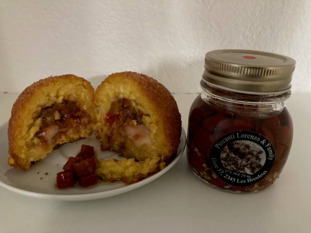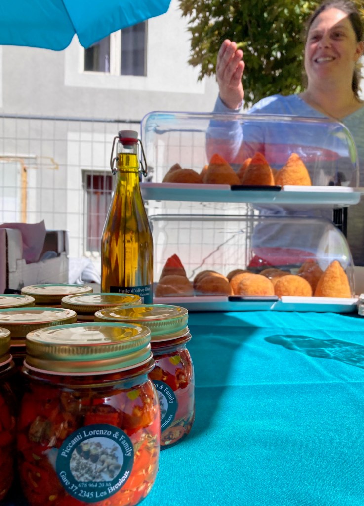 En face, Lorenzo et sa famille « pugliese » des Breuleux propose des arancini aux légumes ou à la viande. Ses bocaux de piments, de force différente, font la joie de mon frigo depuis des mois. L’arancino est une boule frite de riz safrané farci de courgettes, aubergines, poivrons et mozzarella : franchement roboratif !