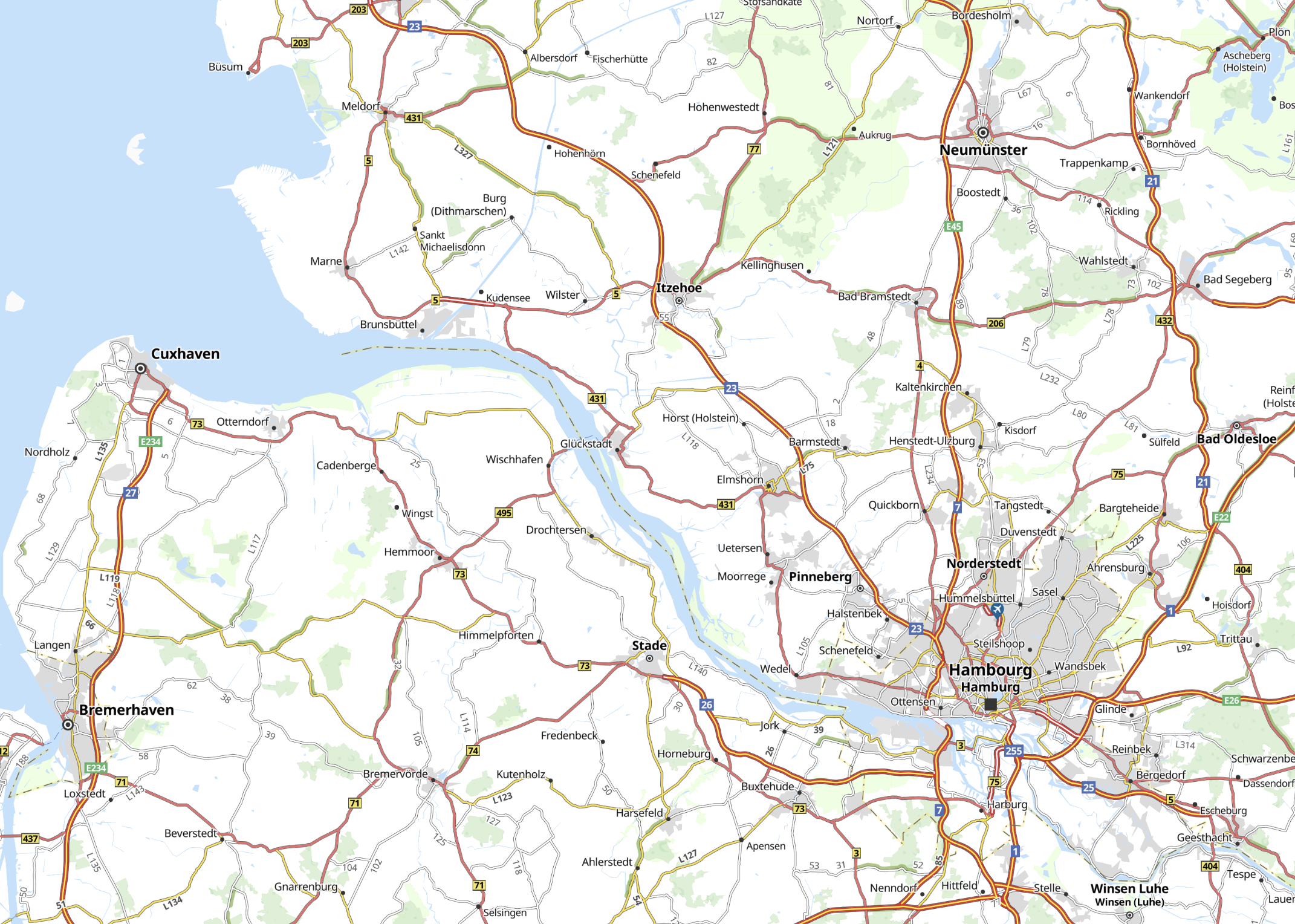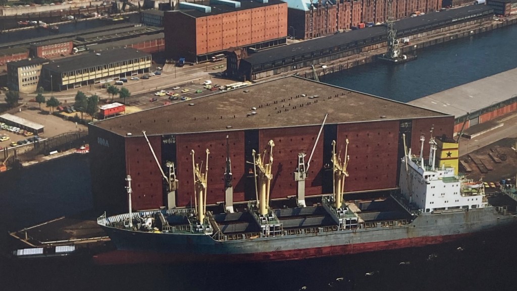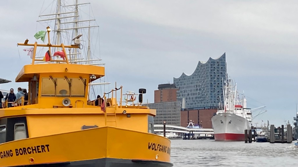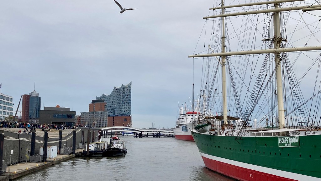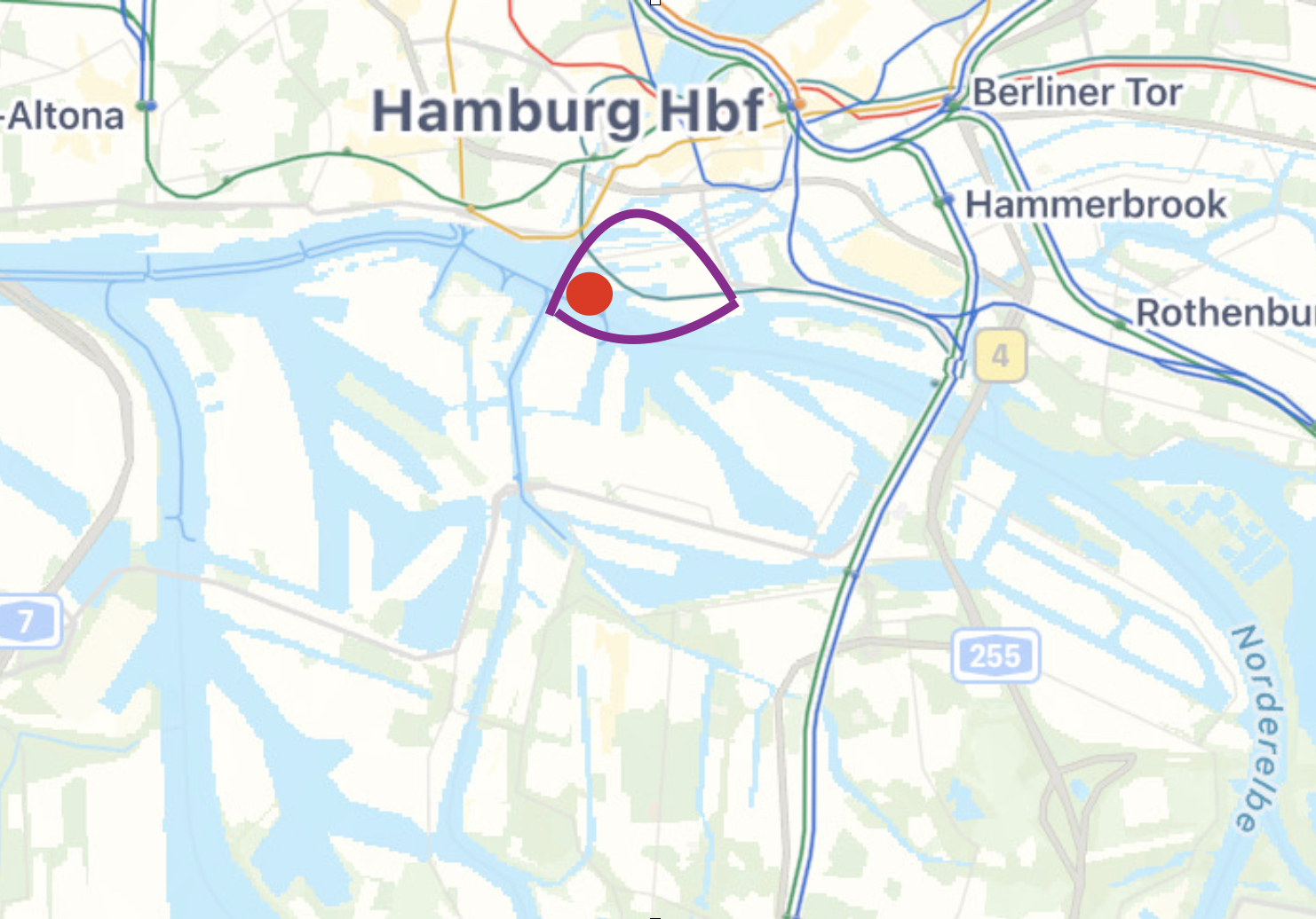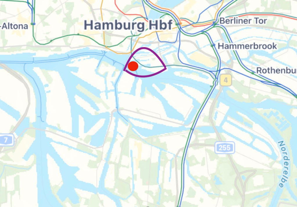 Le port de Hambourg n’est pas maritime mais fluvial. Il se situe sur l’Elbe, grandement aménagé depuis le Moyen Age pour accueillir des navires. Actuellement Hafen City, en violet, est un nouveau quartier construit sur des friches de l’ancien port, aujourd’hui en activité plus au sud. En rouge, l’Elbphilharmonie a été érigée au-dessus d’un ancien entrepôt ayant succédé au bâtiment des douanes à l’entrée du port du XXe siècle.