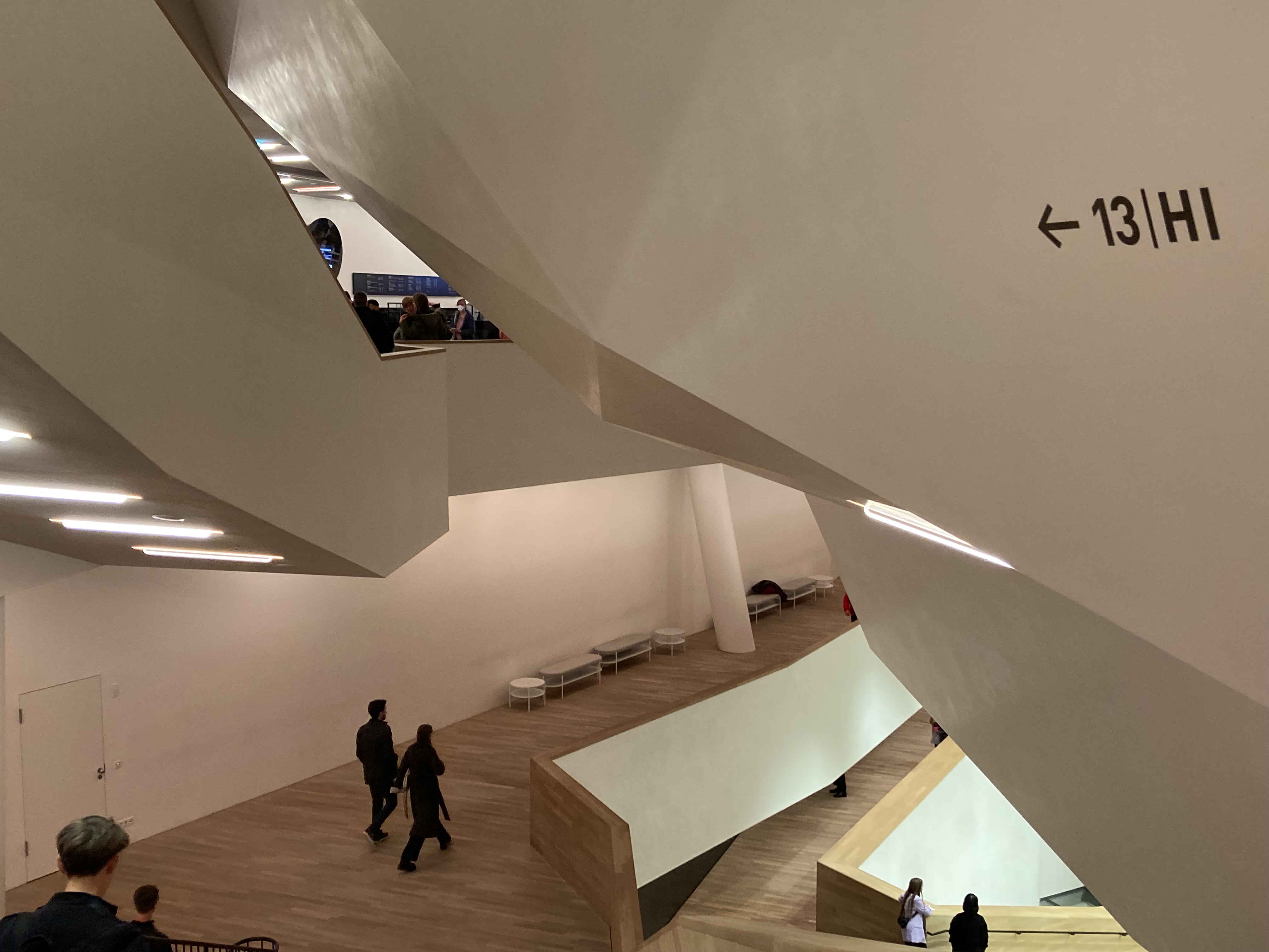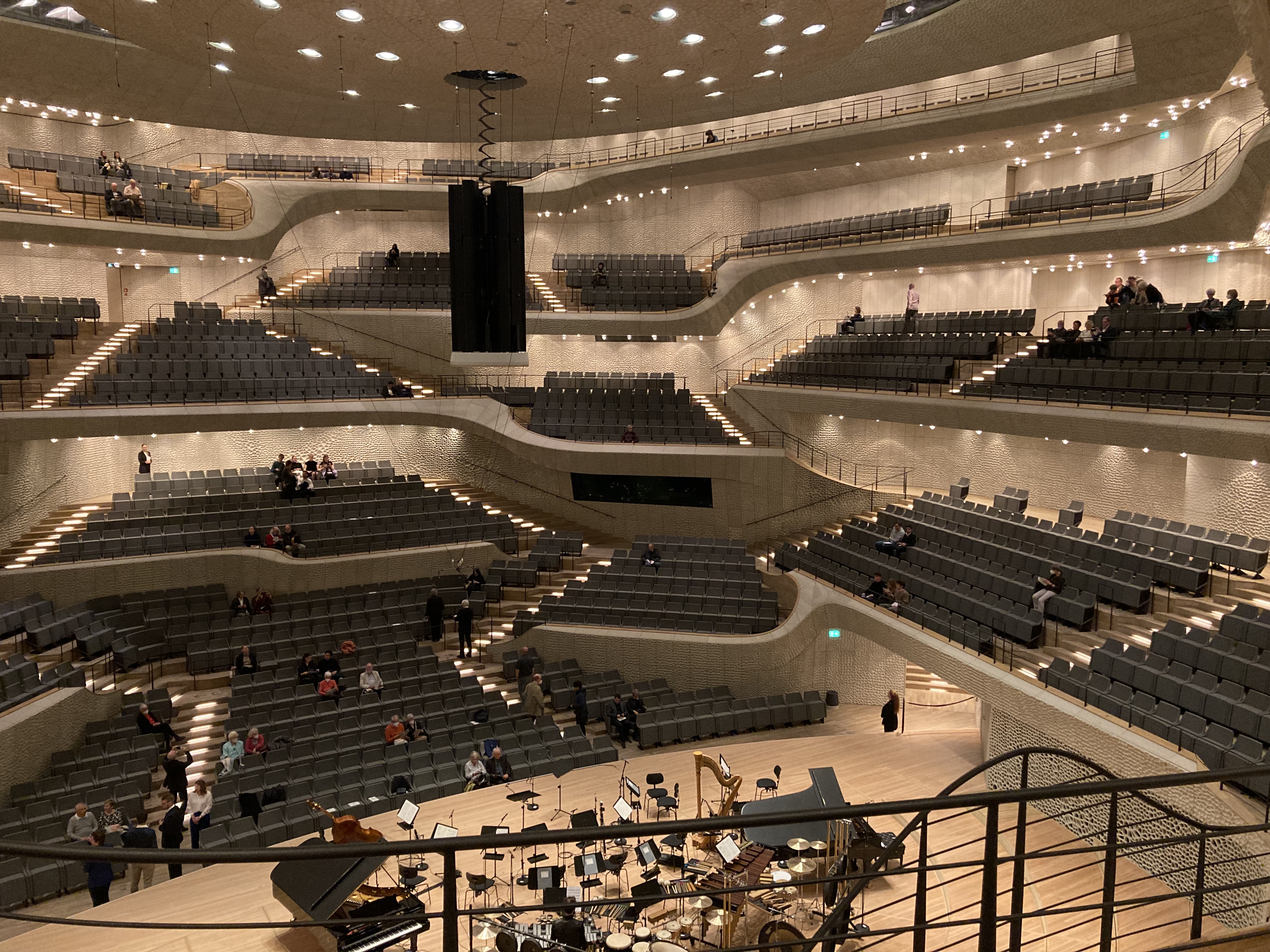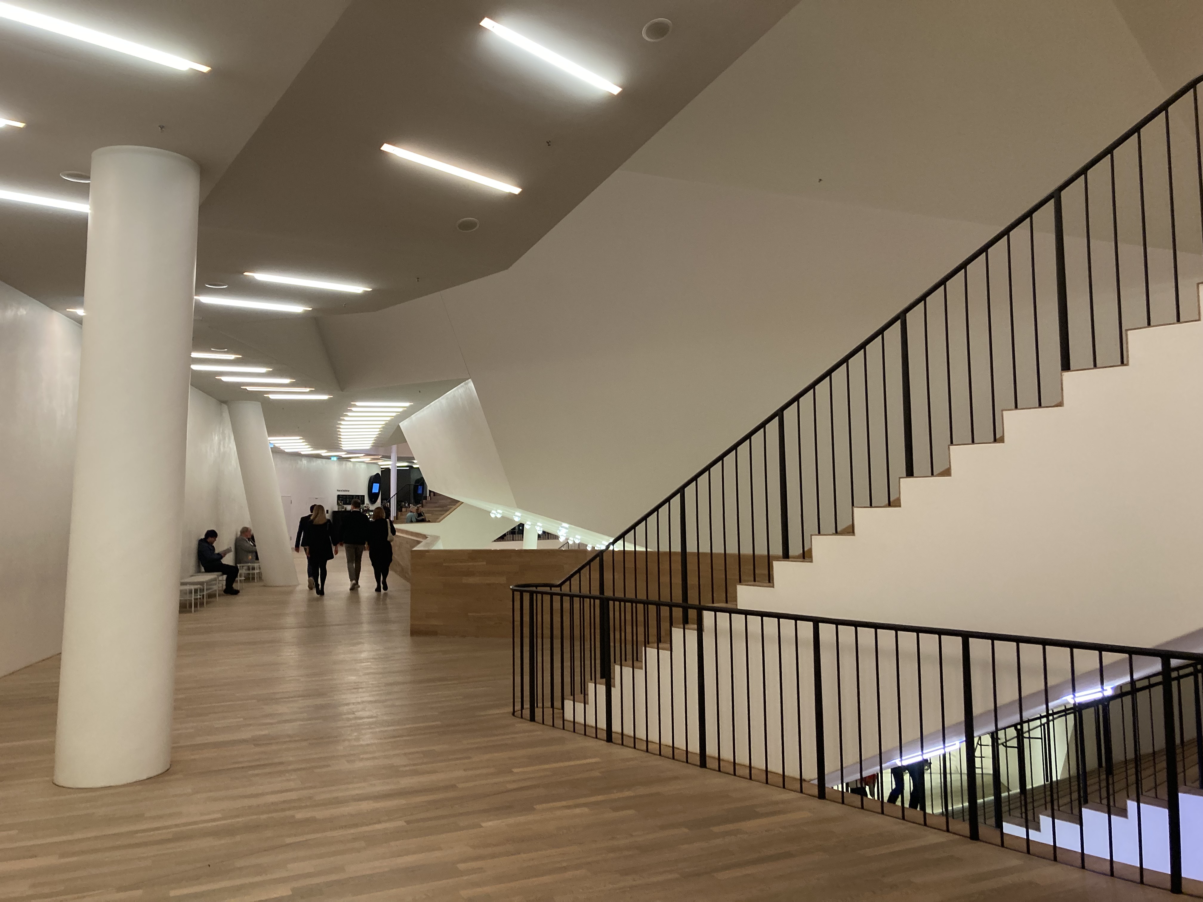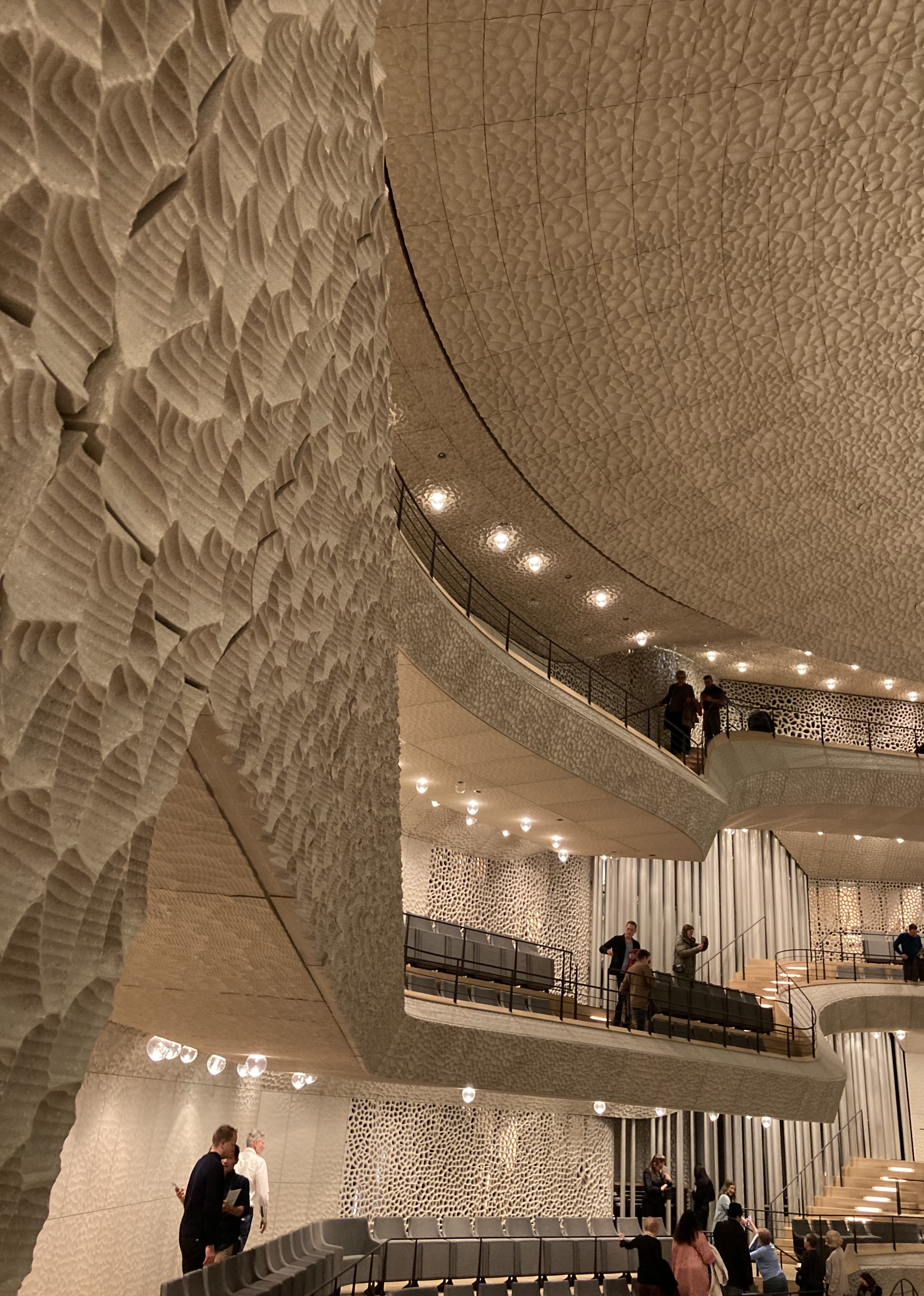 La chaleur du chêne, le rythme asymétrique des terrasses clairement séparées les unes des autres, la visibilité totale de toutes les places, la proximité avec les musiciens, la somptueuse acoustique sublimée par des parois alvéolées en forme de vagues, tout concourt à une expérience intime de l’écoute dans ce « salon » de musique. Dans ce sens, l’Elbphilharmonie s’apparente au Tottenham Hotspurs Stadium dont j’avais parlé en 2019, un stade de 62’000 places où l’on se sent chez soi.