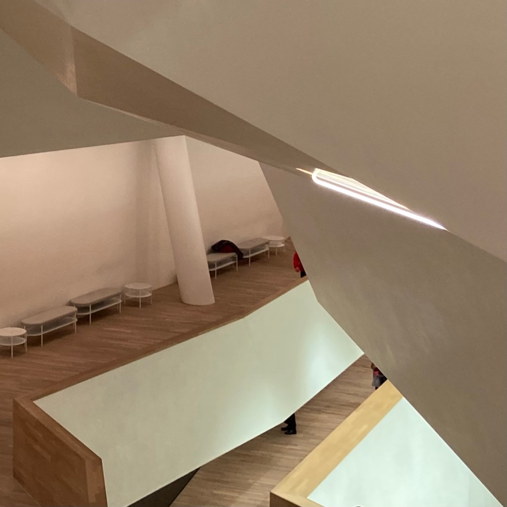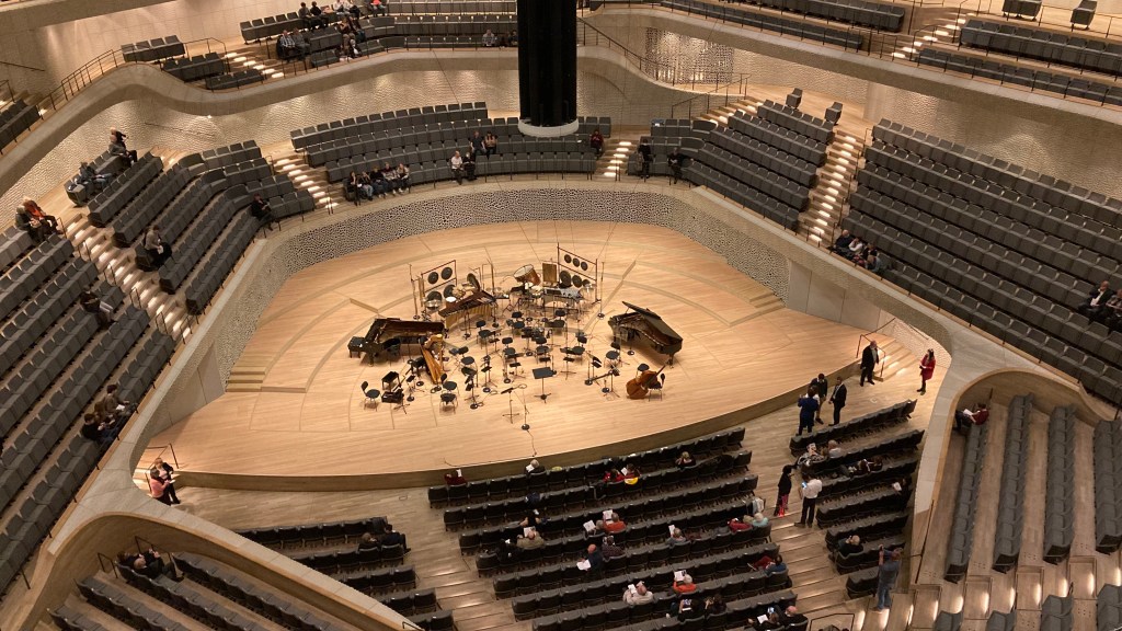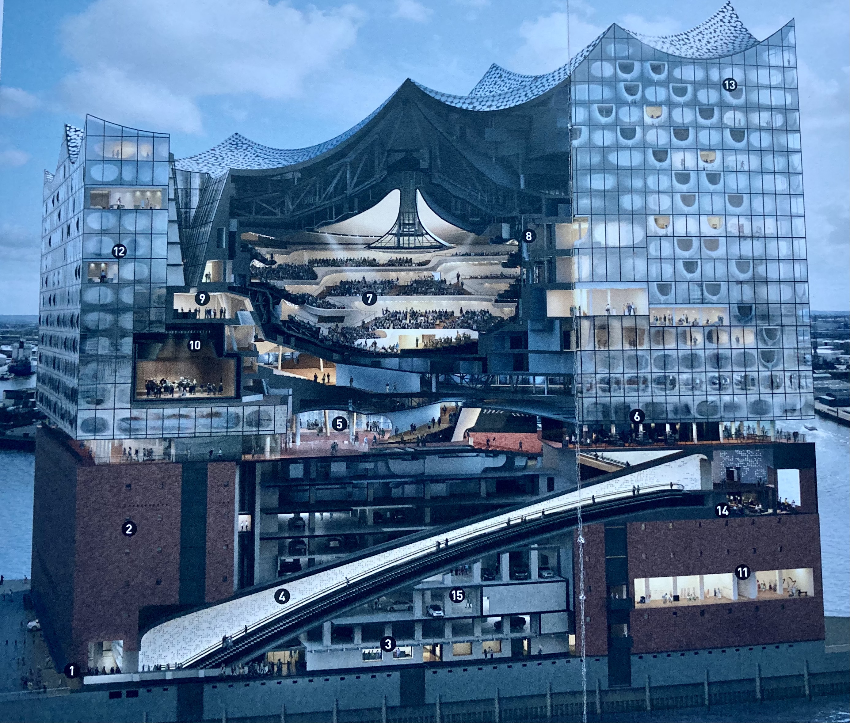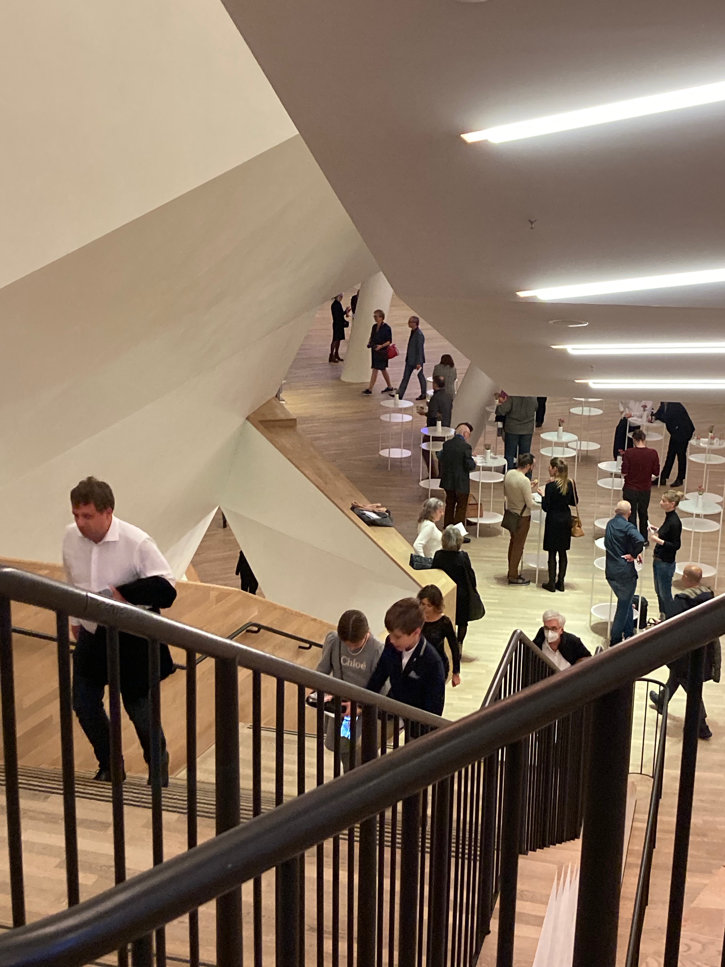 L’enjeu humain d’un tel monstre est de rester dans une proximité chaleureuse avec les visiteurs ou habitants de la ville. Il y parvient de différentes manières qui ne m’ont pas seulement impressionné mais séduit lors de ma venue dans ce lieu le 22 octobre 2022 : le concert en hommage aux 70 ans de Wolfgang Rihm, le pape de la musique contemporaine en Allemagne, ne fut pas très couru. Les 15 euros que m’a coûtés ma place étaient un cadeau pour expérimenter l’intérieur de l' »Elfi ». Avec les musées, les stades et les aéroports, les salles de concert sont les amphithéâtres, les cathédrales et les palais des temps anciens.