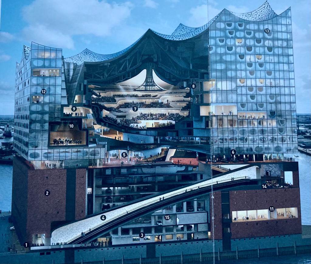 Avec son socle en brique rappelant les thés, cacaos, cafés et tabacs importés à Hambourg, cette voile-proue-vague-iceberg-cristal aurait dû coûter 100 millions de francs. Ce fut 1 millard, une somme monstrueuse qui mena presque à la faillite la ville alors dirigée par le chancelier allemand Olaf Scholz.