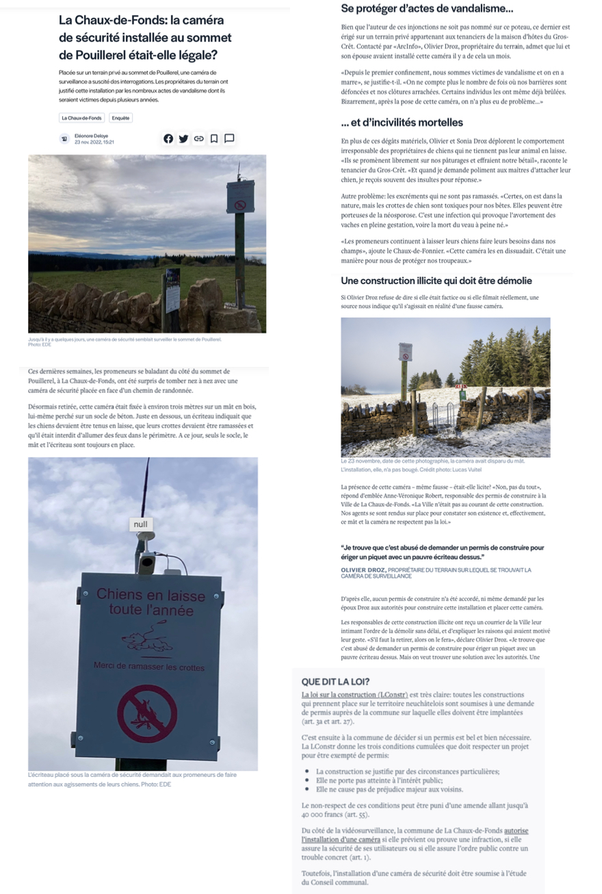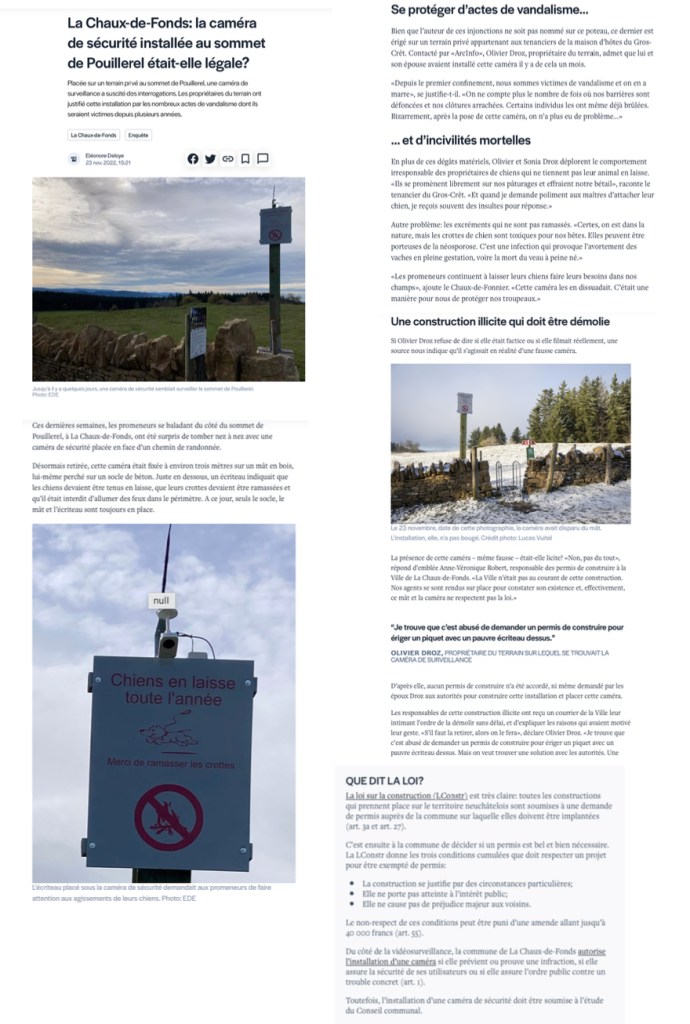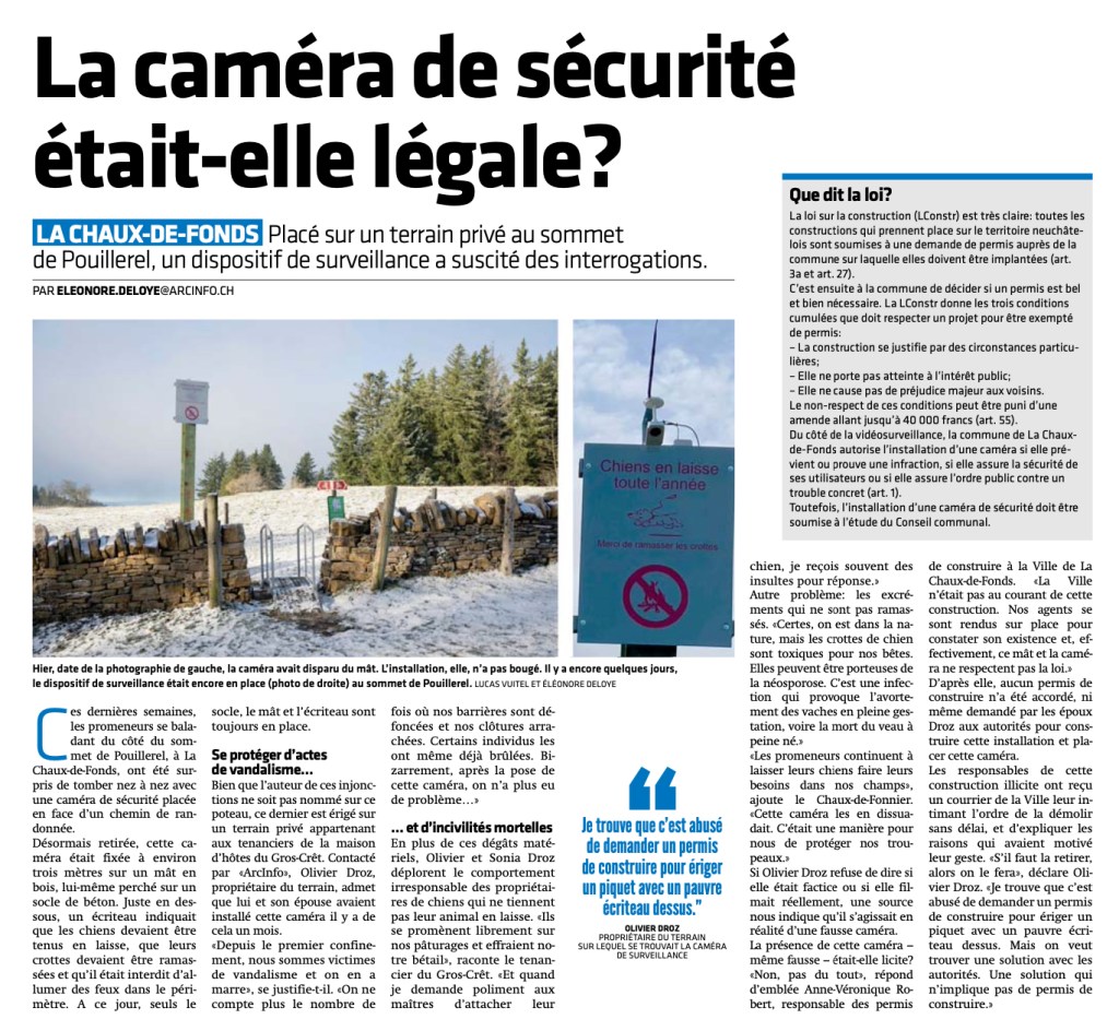 ArcInfo, par Eléonore Deloye, publie un article sur le WEB et dans la version papier qui résume la situation avec les points de vue des propriétaires et des autorités communales. C’est gracieusement que j’ai autorisé Madame Deloye d’utiliser mes photos. La caméra devait être fictive et les propriétaires nous alertent sur un problème qui nous concerne ! À noter cependant que M. Droz n’avait pas érigé un piquet mais un grand poteau en métal reposant sur deux blocs de béton, et il n’y avait pas qu’un écriteau mais une caméra !
