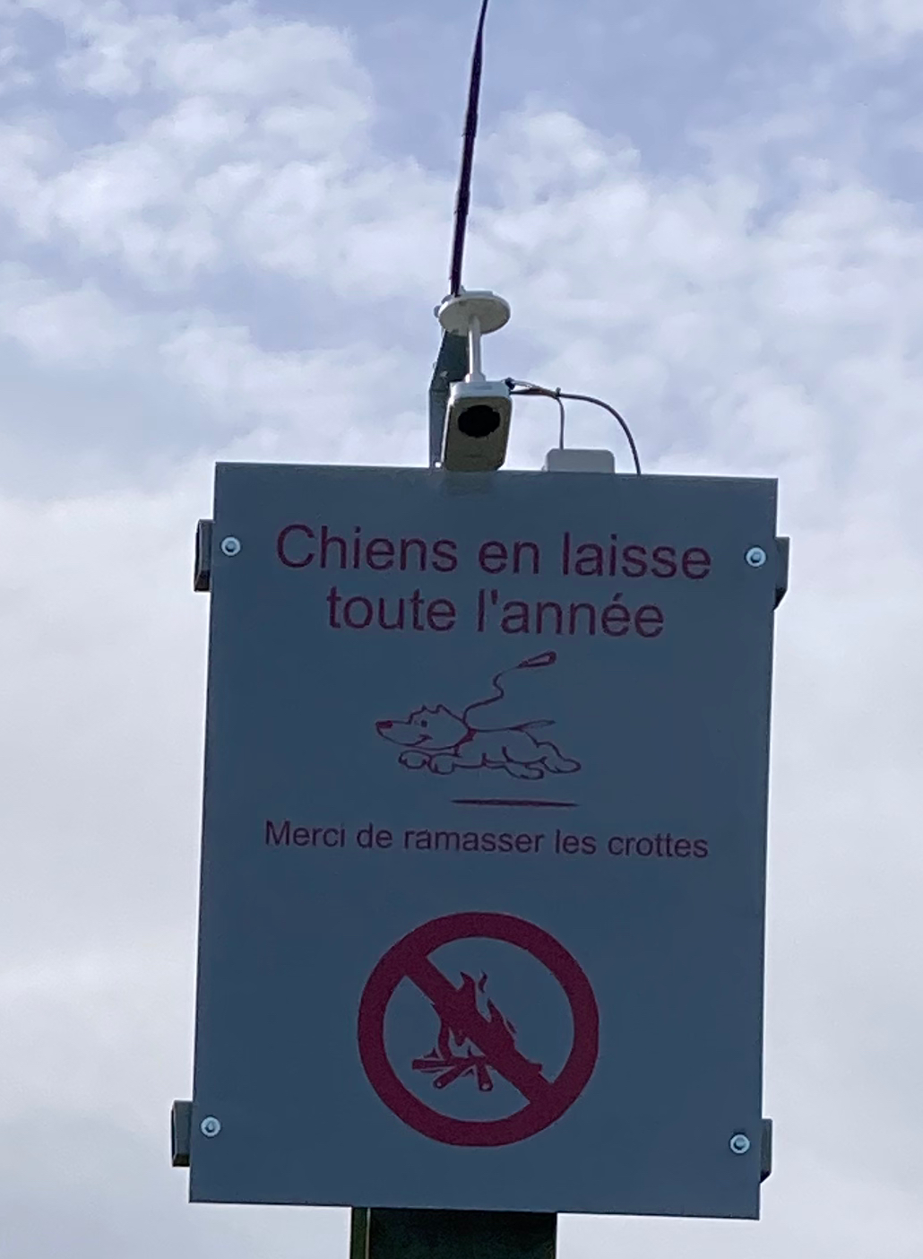 Les faits : l’ensemble est formé d’un grand socle, d’un poteau métallique de plus de deux mètres de haut, d’un panneau anonyme et d’une caméra avec une antenne apparemment alimentée par un mini panneau solaire. Deux fils relient la caméra au mini panneau et à l’antenne.