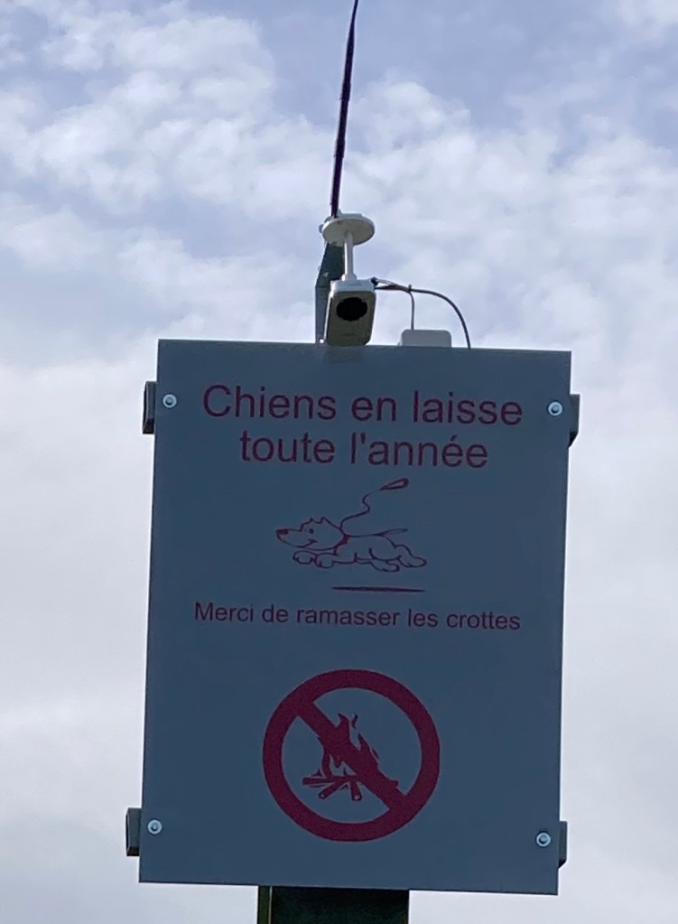 Sur le panneau fixé à deux traverses métalliques du poteau sont écrites et dessinées deux injonctions destinées aux promeneurs venant du sommet : tenir les chiens en laisse et ne pas faire de feu.