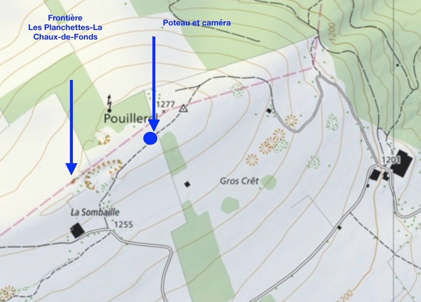 Le poteau est installé sur un terrain privé qui se trouve, si la carte ci-dessus est juste, sur la commune de La Chaux-de-Fonds, à la frontière de la commune des Planchettes. La caméra est braquée sur un terrain agricole appartenant à la Commune de La Chaux-de-Fonds. La frontière entre les deux communes est tracée en traits rouges pâles.