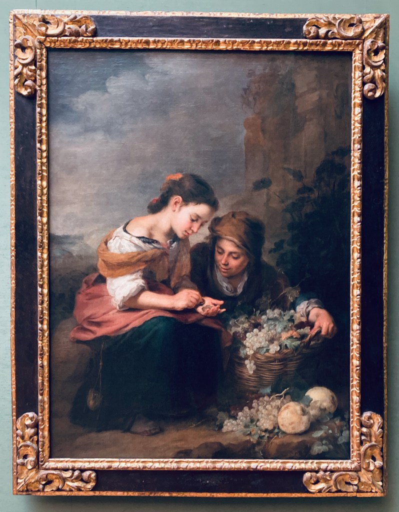 J’ai déjà exprimé mon amour pour un peintre sous-estimé, le grand Murillo, contemporain sévillan de Velazquez. Sa petite Marchande de fruits de 1670 compte les sous de sa journée. Elle est une Madone de douceur et de tendresse devant son frère quasiment saisi par la belle somme. Et quelle nature morte à droite !