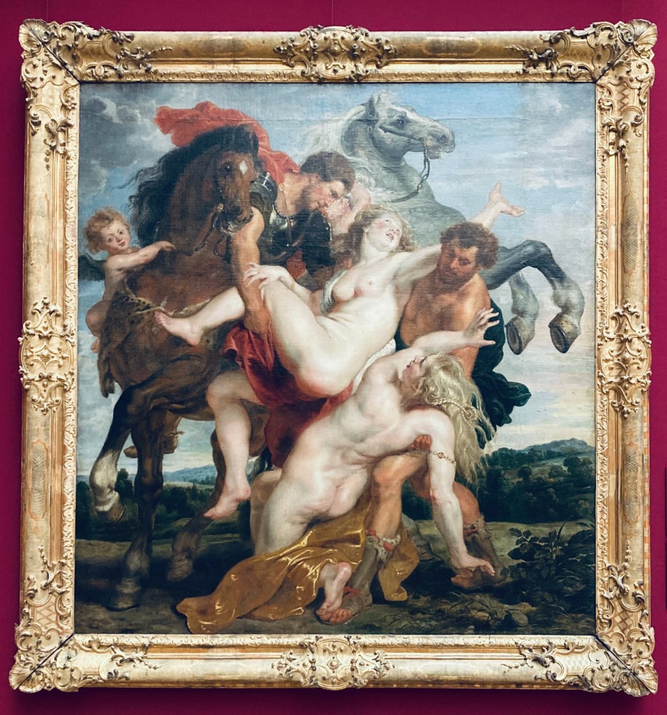 Vers 1620, le baroque est triomphant chez Rubens qui laisse éclater sa sensualité à travers L’enlèvement des filles de Leucippe, sauvagement ravies par Castor et Pollux. La jeune femme et sa soeur semblent trouver du ravissement dans ce rapt par des colosses bien musclés.