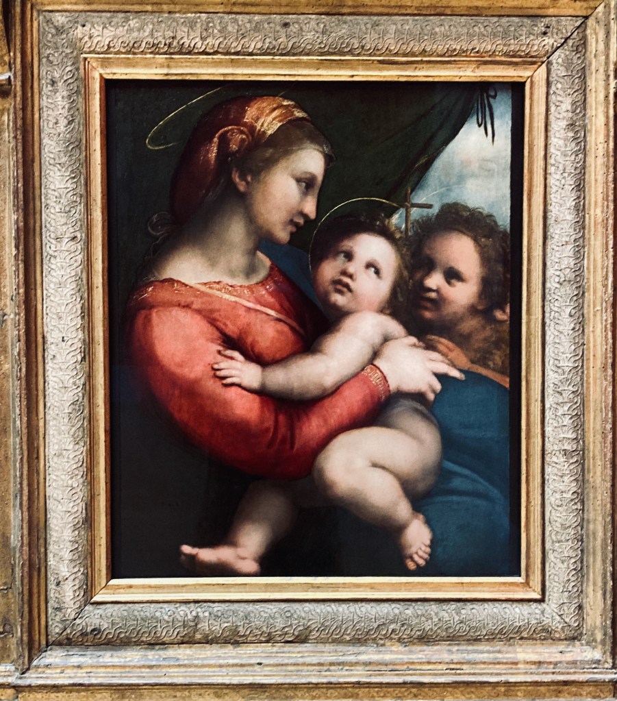 Quarante ans plus tard, Raphaël, déjà maniériste, entrelace les chairs dans sa Madone au rideau.