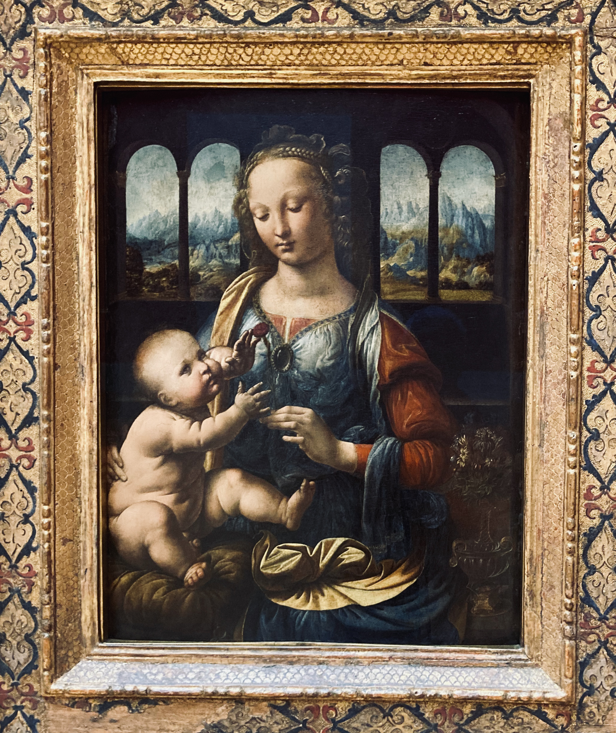 Un peu plus tard au Sud, en 1475, le jeune Léonard s’essaie à une vierge à l’enfant dans sa Madone à l’oeillet. Jésus pose un doigt sur la fleur rouge, prémonition de sa Passion et le peintre expérimente déjà avec génie le paysage en sfumato. Le monde est un mystère à explorer et à percer.
