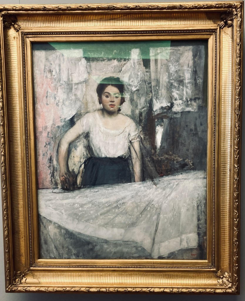 Autre jeune femme, la Repasseuse de Degas qui peint les tissus avec les frous-frous délicieux de son pinceau; plus tard, il sera le maître du pastel, plus apte à saisir le fugitif des tessitures.