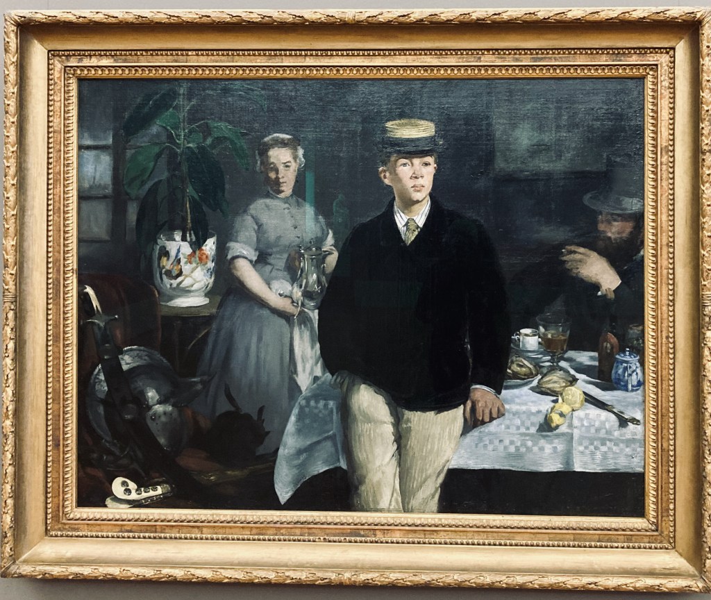 Dans la même décennie, en 1868, Manet est libéré des scandales de l’Olympia et se donne à « pinceau libre » dans les vêtements, les citrons et les huîtres de son Déjeuner.