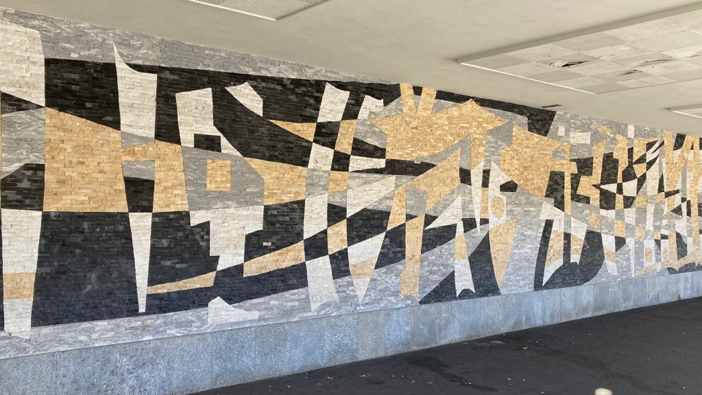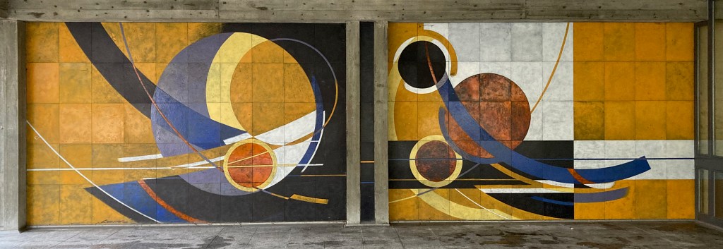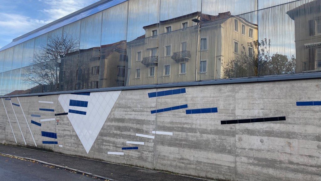 La montée vers le sud de la ville procure davantage de joies. Joie de voir irradier la grande céramique de Loewer sur la face nord de la salle de gymnastique des Crêtets.