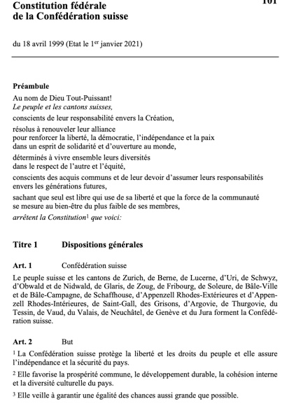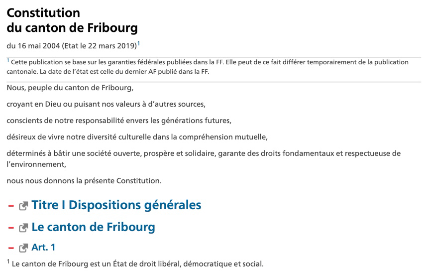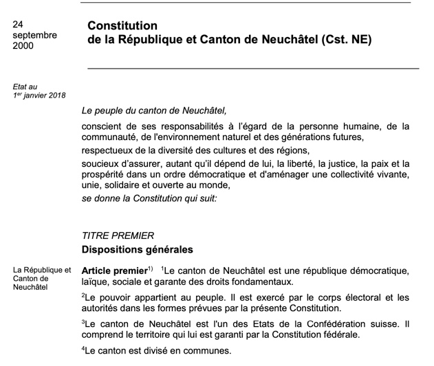 Notre République, dans le préambule de sa constitution, ne fait aucune référence à Dieu, un être supérieur ou des croyances qui guideraient les articles constitutionnels. Ce n’est bien sûr pas le cas des constitutions fédérale ou même fribourgeoise, révisée en 2004.