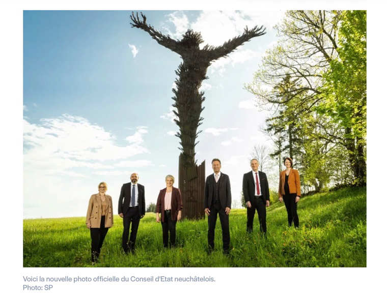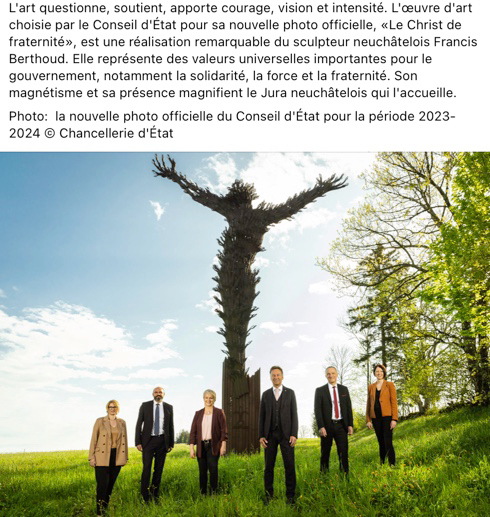 Quatre jours après Pentecôte, le gouvernement neuchâtelois a publié sa photo officielle 2023-2024. Cinq petits ministres devant un immense Christ sculpté. Image certes pas outrageuse, croyant être courageuse, mais surtout outrancière dans les transgressions qu’elle impose : l’esprit qui l’induit n’est pas très sain.