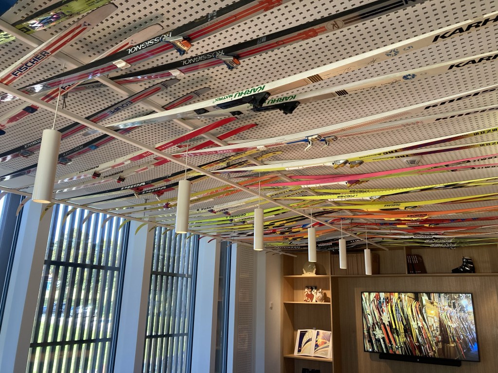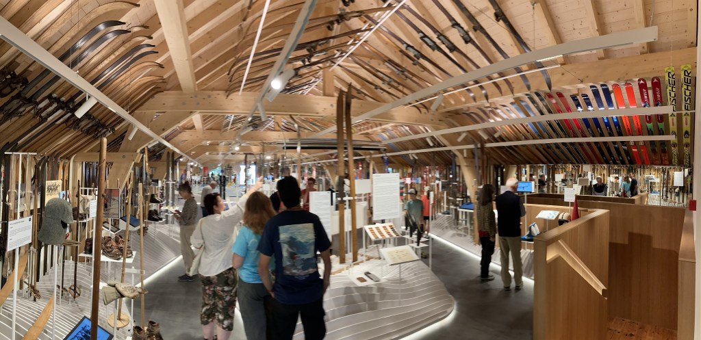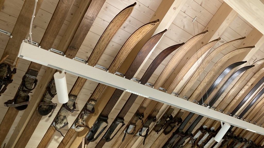 La visite commence au deuxième étage avec la collection mirifique des skis patiemment collectionnés depuis cinquante ans par Laurent Donzé. L’espace est agrandi par des miroirs. À droite, le ski nordique, à gauche le ski alpin, au centre des alvéoles sur les matériaux, les fixations et le fartage. Des images fixes ou filmées, datant parfois même de plus d’un siècle, alimentent la nostalgie d’une époque révolue, sans remontées mécaniques ni canons à neige.