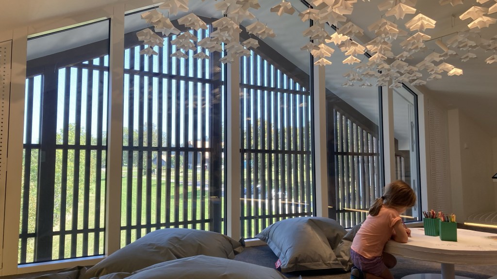 À l’est un espace dédié aux enfants mais aussi aux plus âgés qui peuvent se relaxer au creux de grands coussins : nous sommes toutes et tous empli.e.s du désir de l’avenir en marche et de la neige continuant de tomber.