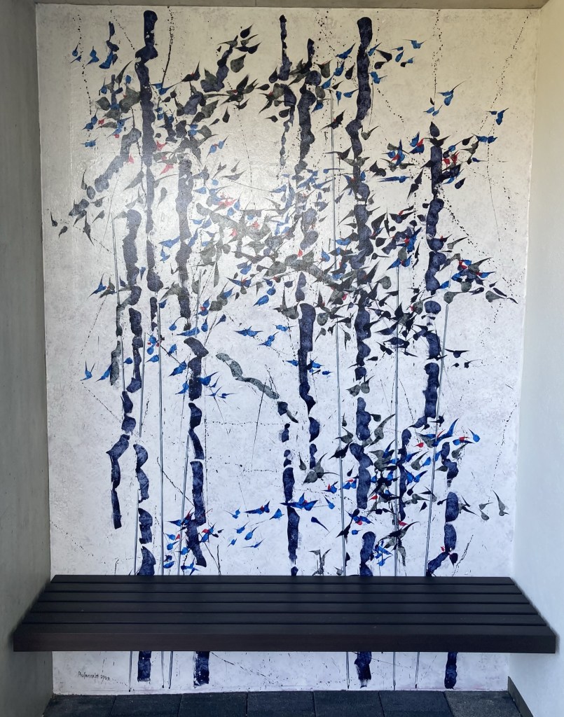 L’entrée est magnifique par la fresque réalisée par Philippe Rufenacht, qui sait faire vibrer les couleurs et les éléments.