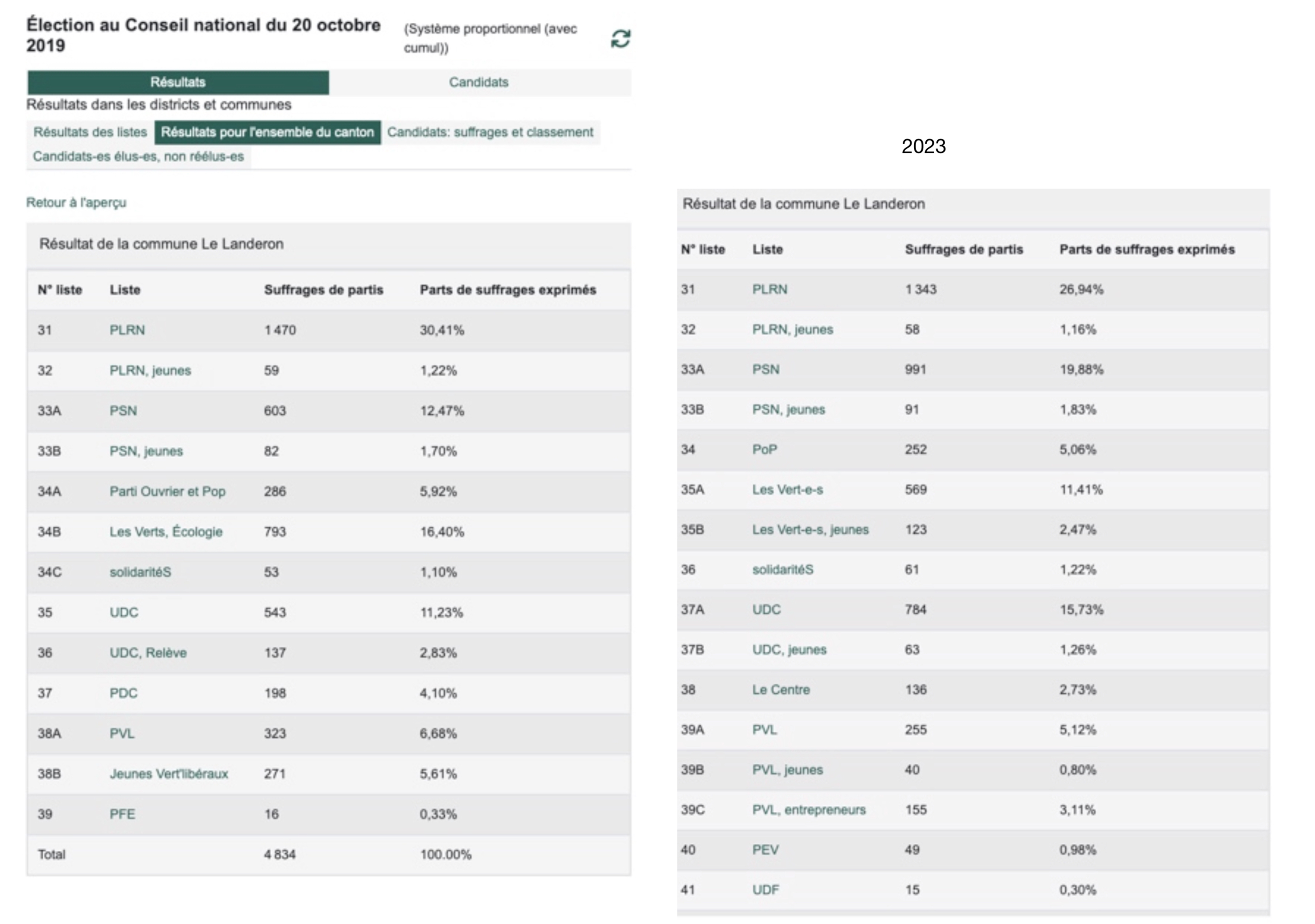 Cette commune « urbaine » et non rurale comme Brot-Plamboz ou les Verrières ne confirme pas la tendance rurale, sauf le bond de l’UDC de 14 à 17,66. Le PLR perd plus de 4 points La gauche augmente même son score de 4 points, avec un bond du PS de plus de 6,5 points. Les centristes-VL confirment leur très nette baisse de 5 points. L’électorat inquiet s’est polarisé sur l’UDC ou le PS et a délaissé le centre-droit qui perd 10 points. A ce stade on peut faire l’hypothèse que la gauche pourrait garder ses 3 sièges.
