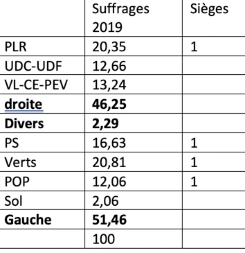 En effet, pour garder son troisième siège, la gauche aurait dû faire trois fois plus que l’UDC, soit 53,88 %. Le POP a fait un mauvais score de moins de 10 % et si la gauche avait eu trois sièges, c’est le PS, qui en aurait eu deux.