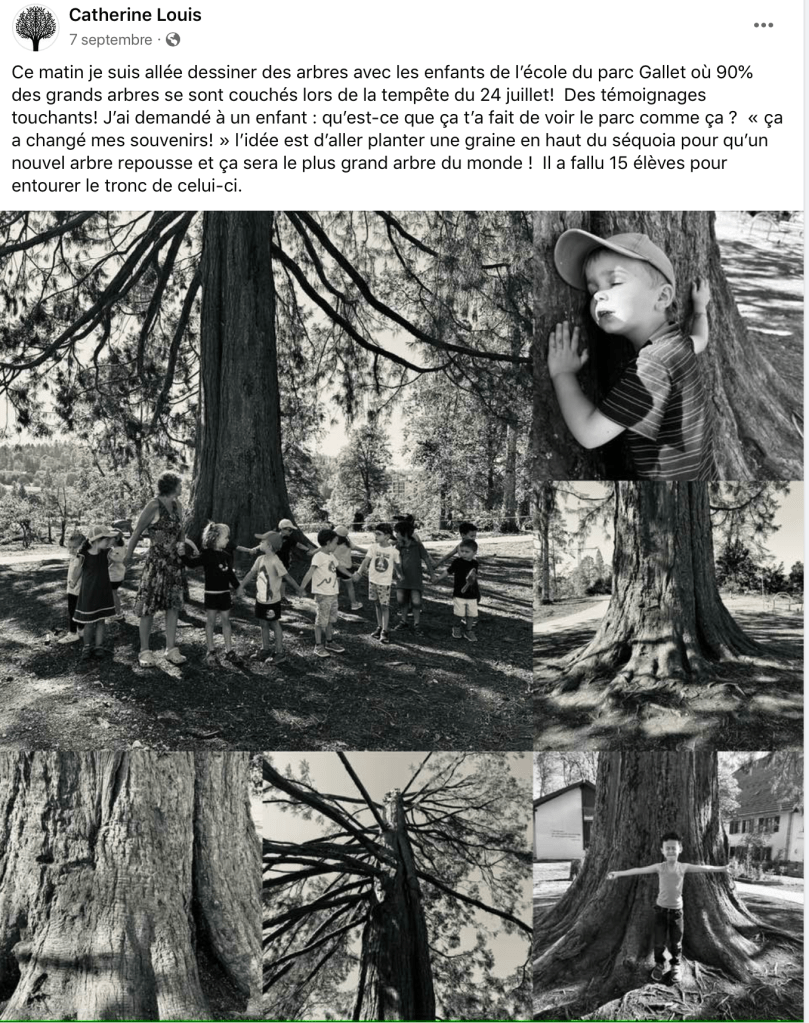 Qui n’a pas été ébranlé dans ses racines intimes par la tempête qui a ravagé la ville de La Chaux-de-Fonds le 24 juillet 2023 ? Catherine Louis s’est rapidement engagée à animer des activités créatrices avec des enfants fréquentant l’école du parc Gallet. Ils ont dessiné des arbres.