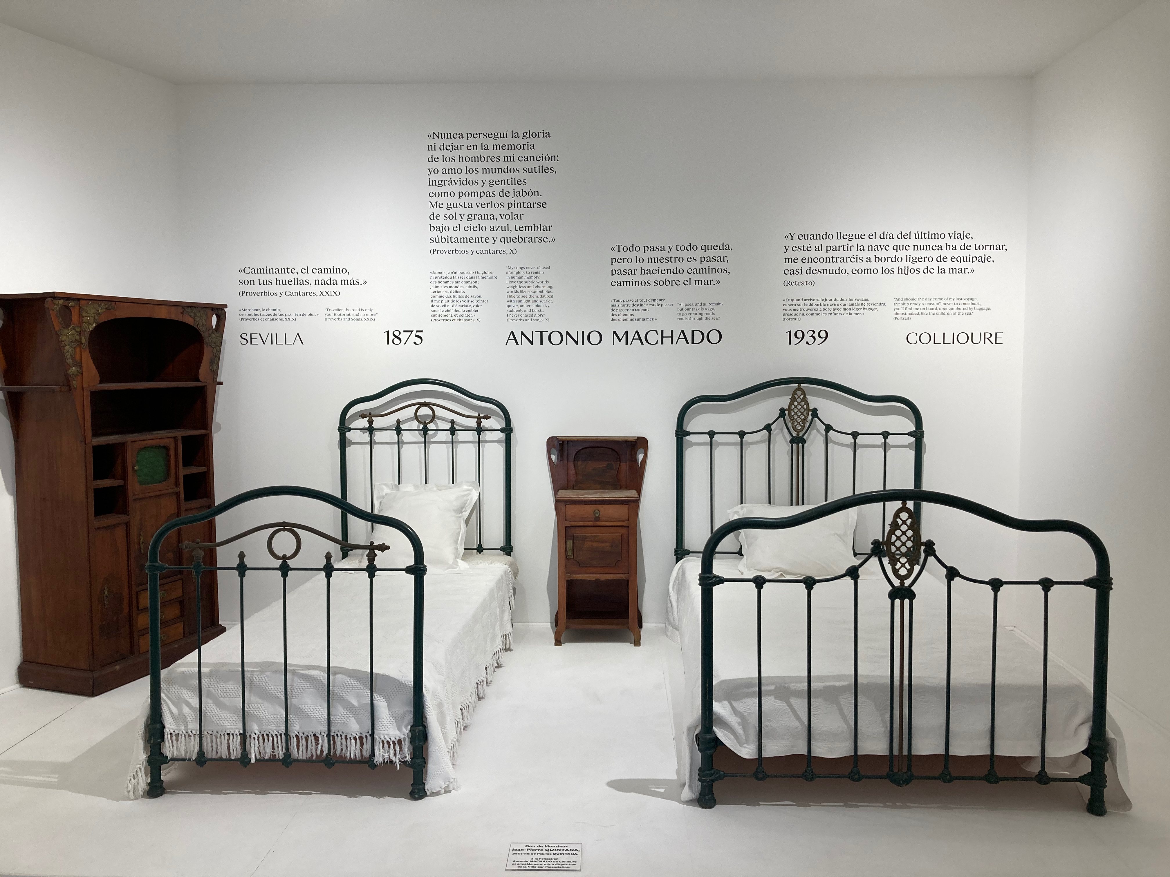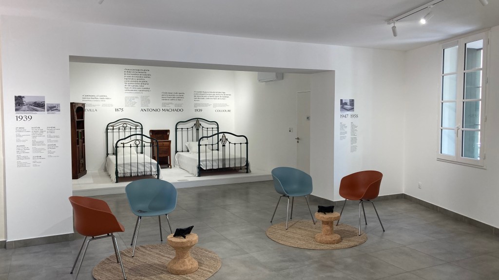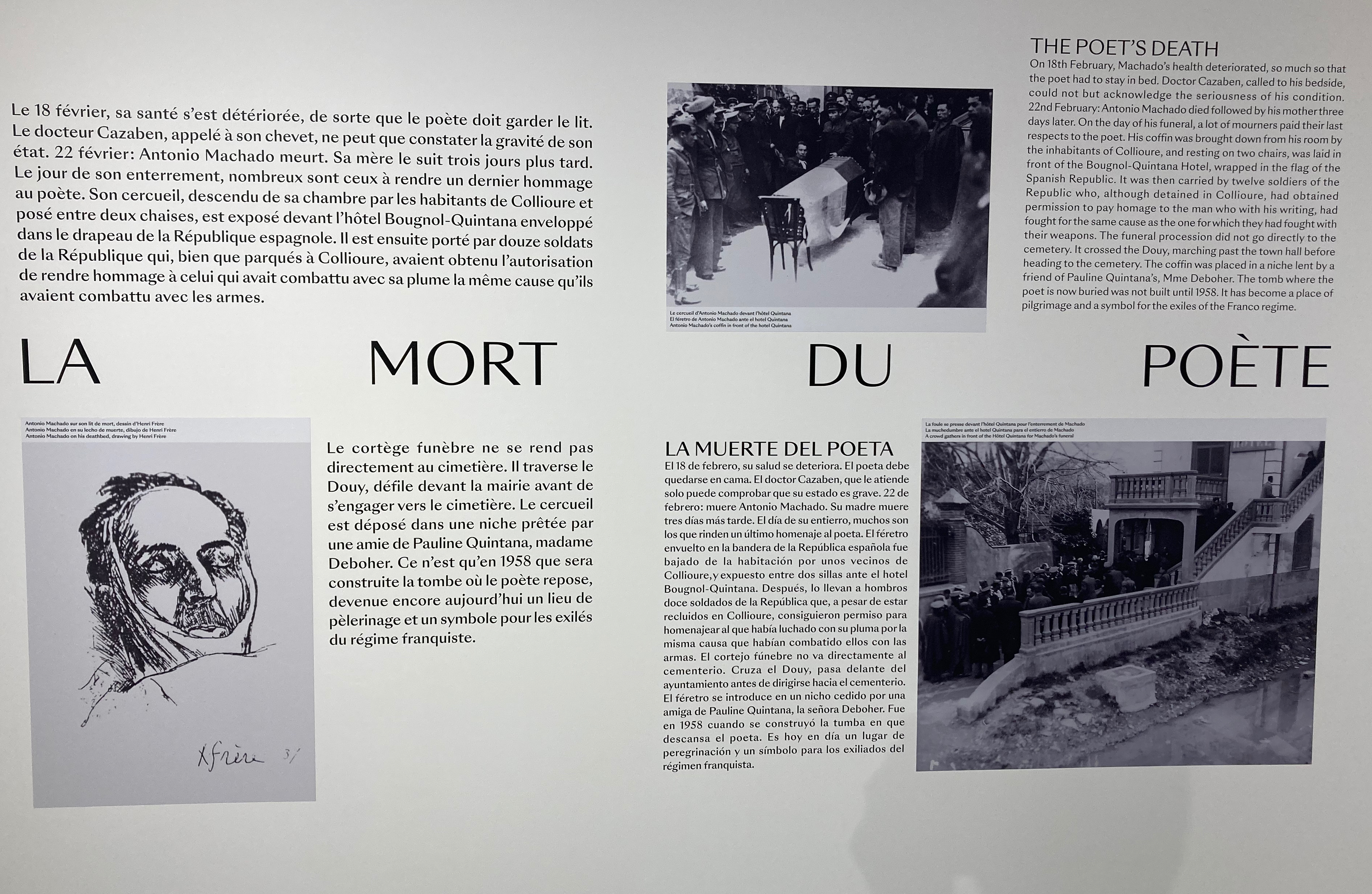 L’espace muséographique est sobre, avec les deux lits de mort du poète et de sa mère, des panneaux explicatifs des derniers jours de la vie de Machado, l’original du registre de l’hôtel avec son nom et sa profession, « professeur ».