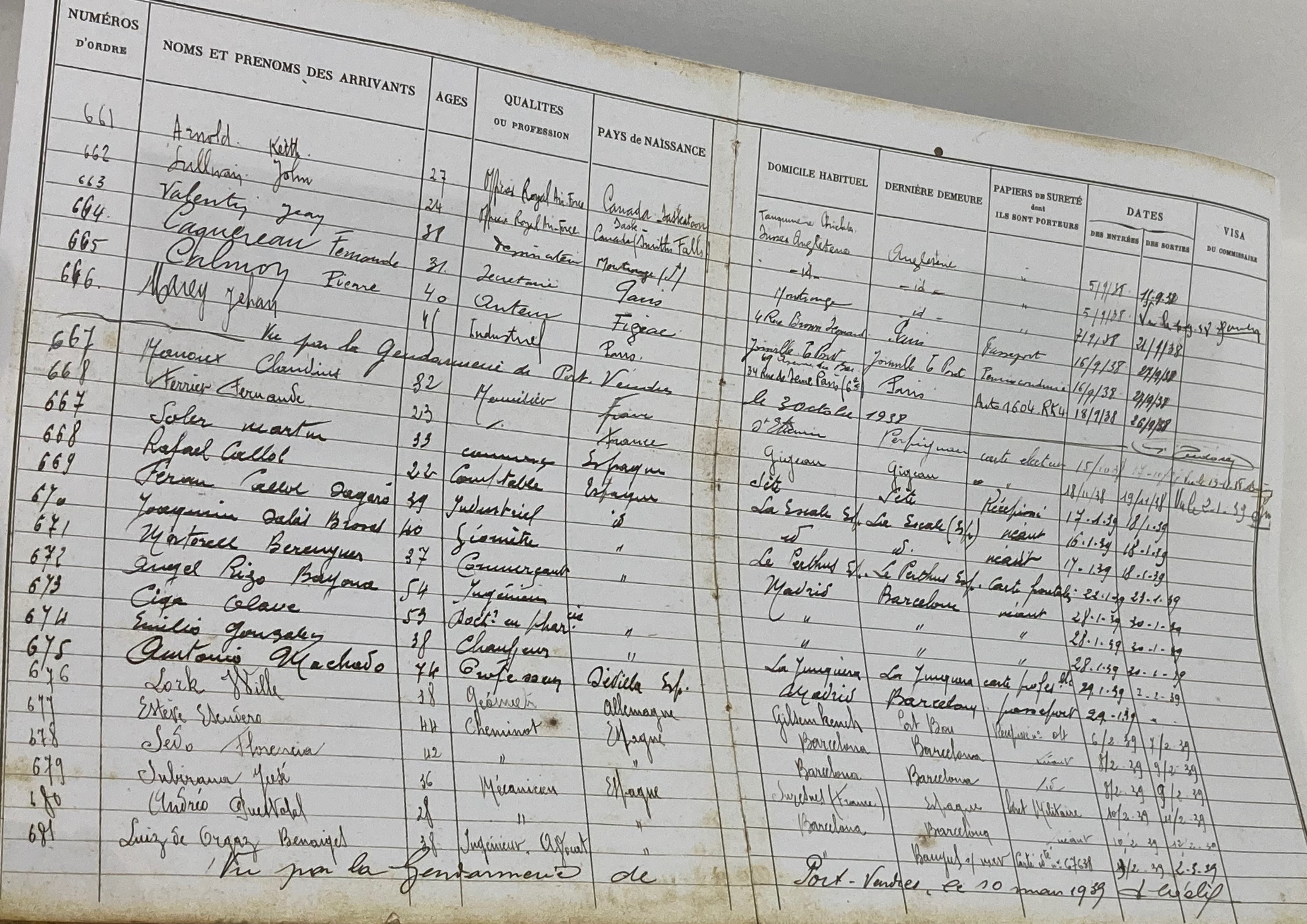 C’est Jacques Baills, qui tenait le registre de l’hôtel pour Mme Quintana, qui reconnaît à son nom (il s’était inscrit comme simple professeur) le poète dont il avait étudié quelques poèmes durant ses études et qui lui demande confirmation. A noter l’erreur concernant l’âge de Machado sur le registre.