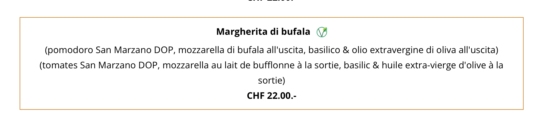22 francs pour une margherita de cette qualité dans notre canton est un prix qui m’a paru bas en regard de la hauteur de mon plaisir…