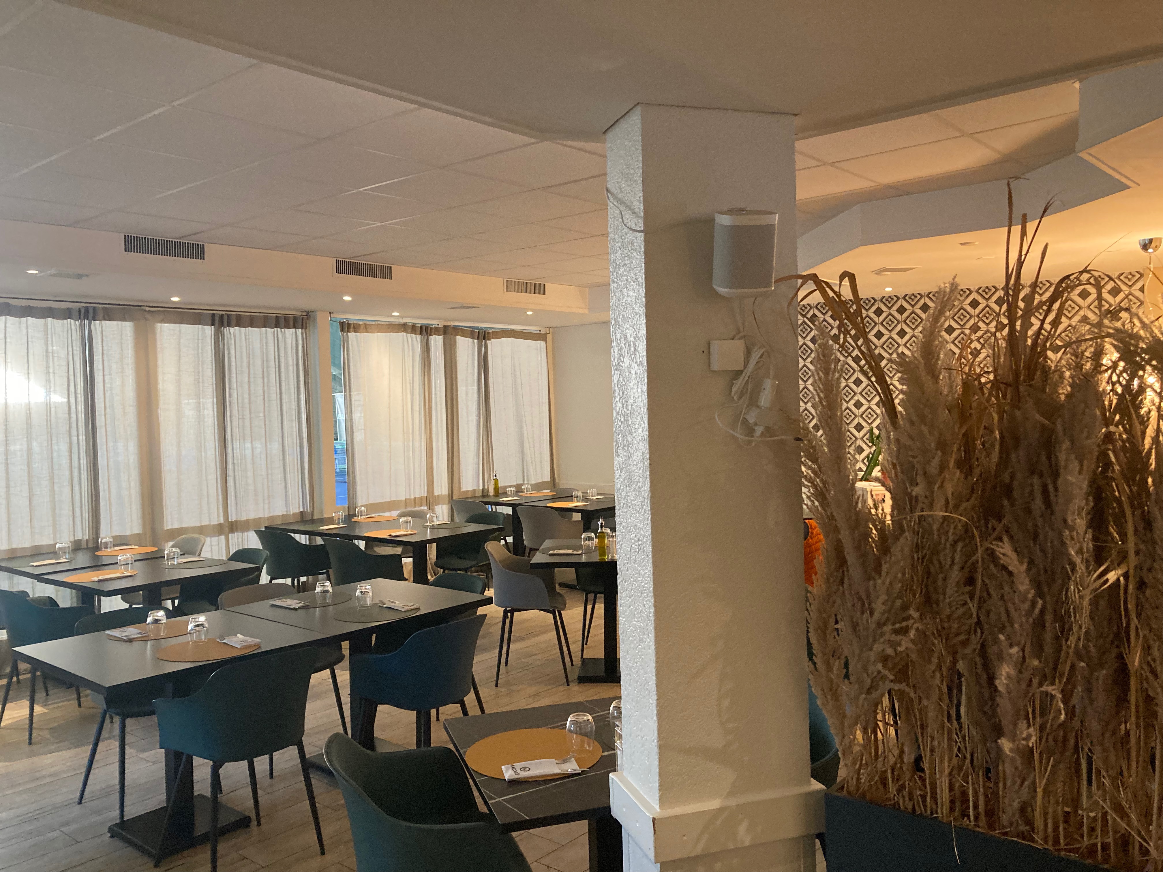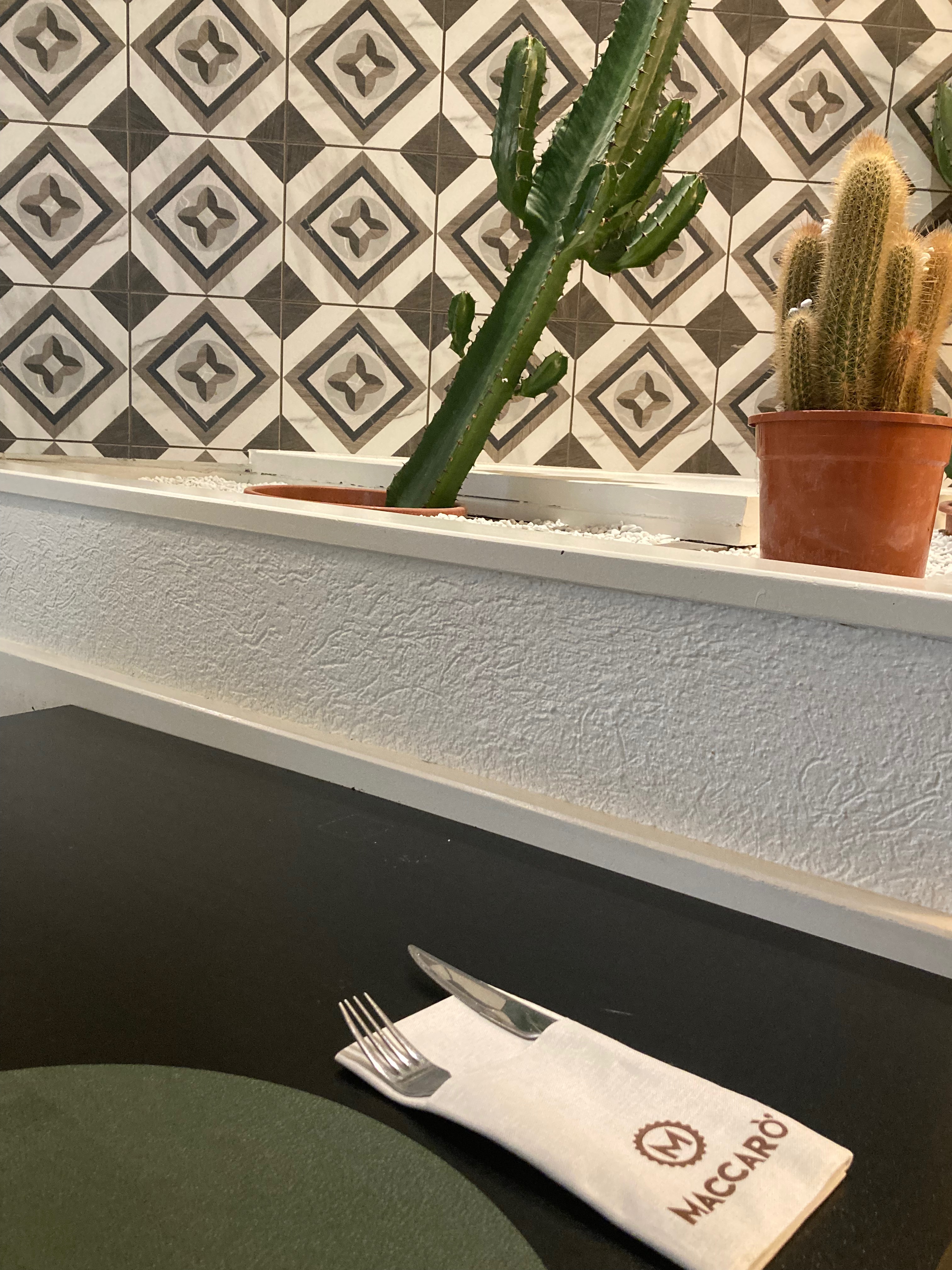 Le restaurant Maccaró donne sur des halles de tennis mais est raffiné dans son décor.