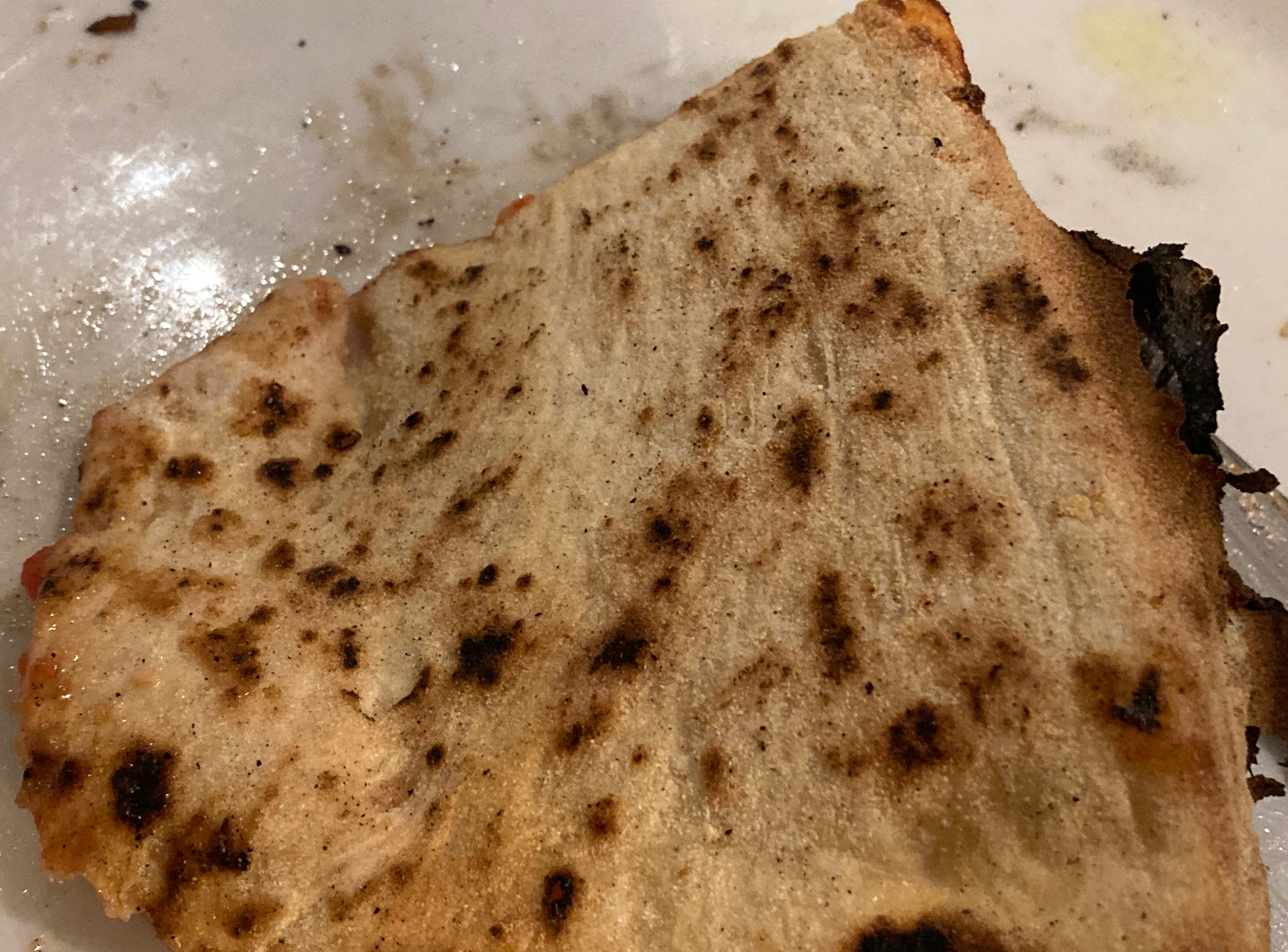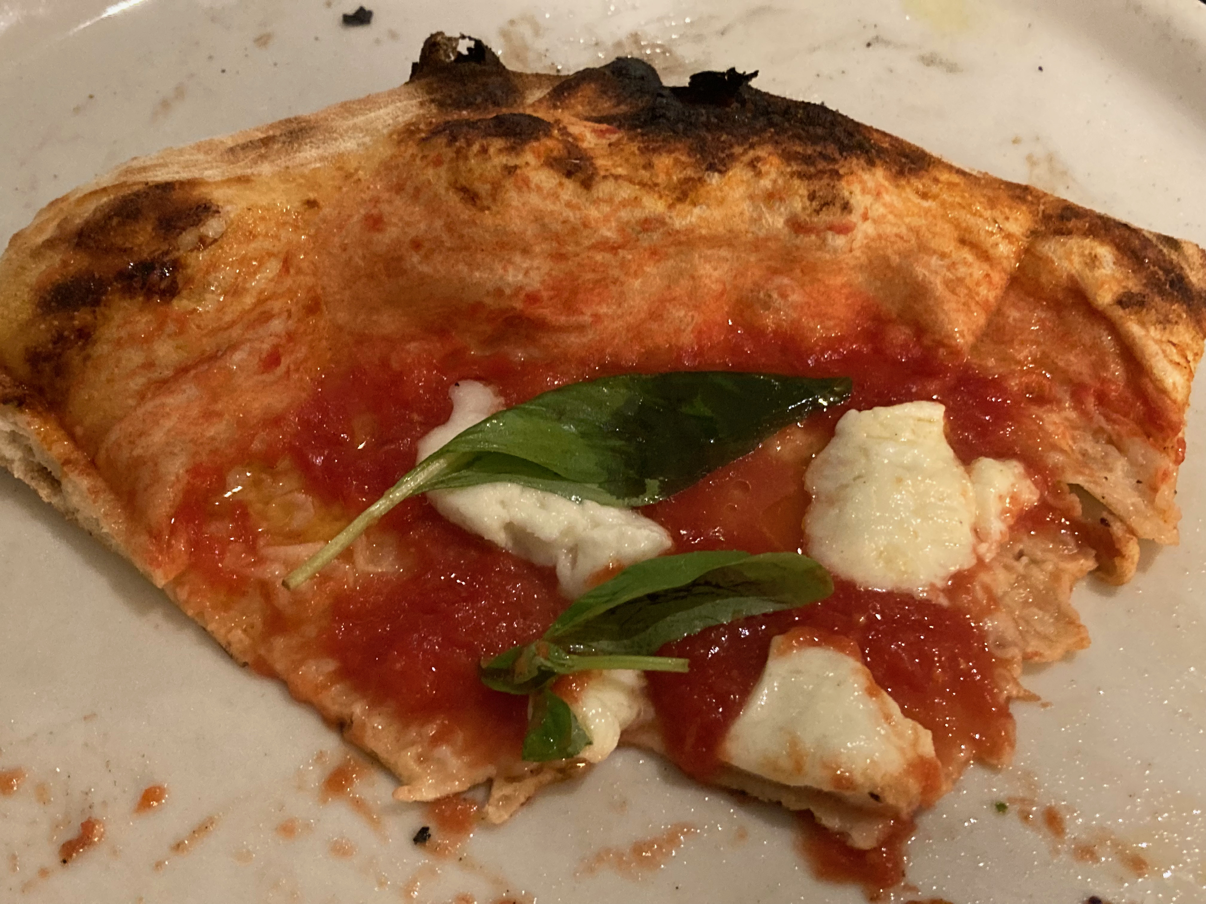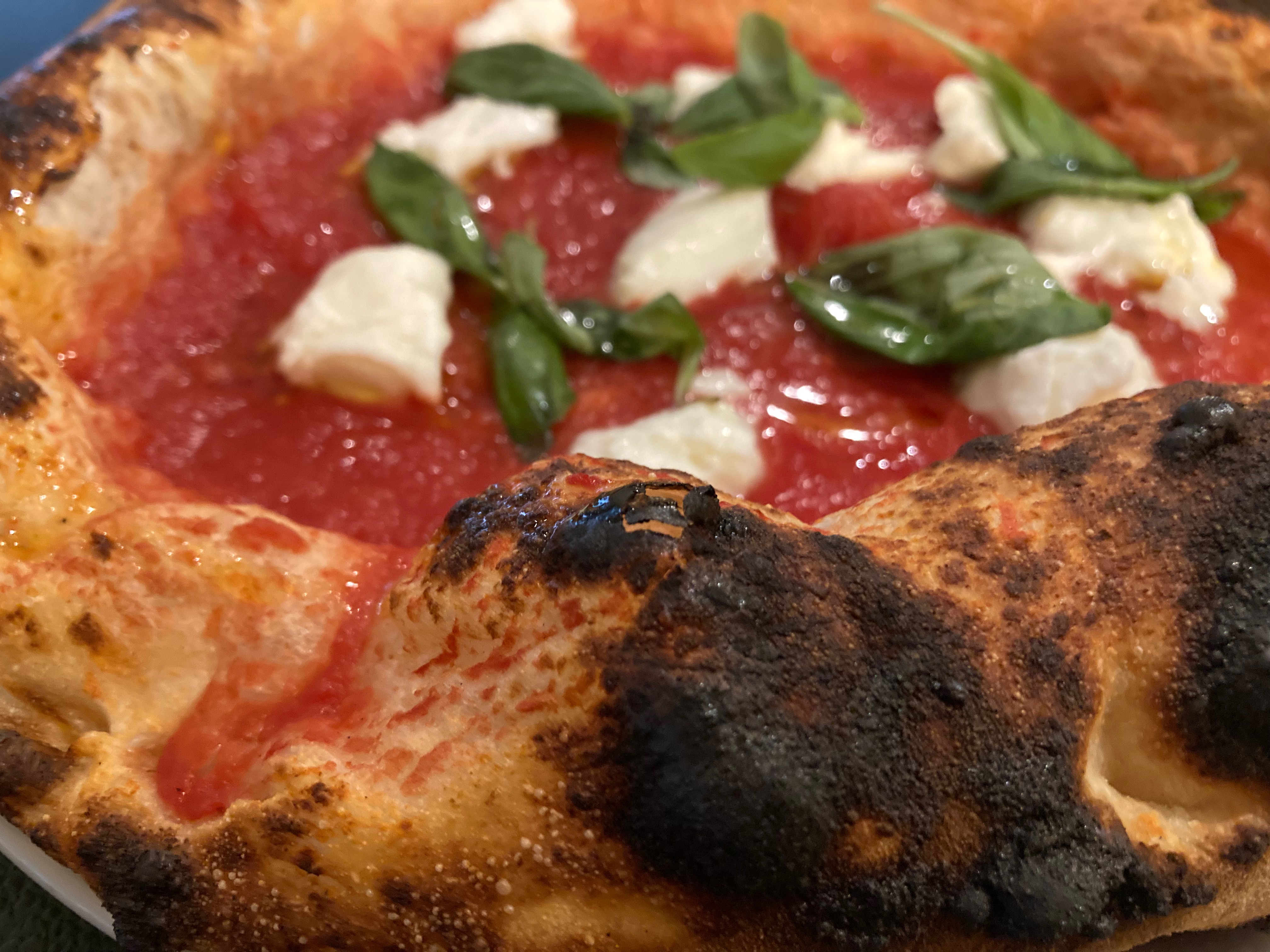 La cuisson se fait en cuisine dans un four électrique, atteignant sûrement les 400 degrés. Après deux minutes, le résultat est spectaculaire. Le cornicione, le cornichon des bords de la pizza, est soufflé, d’une épaisseur immense mais aérienne. Il est comme il se doit léopardisé avec des tâches foncées sur le fond plus clair. Le dessous de la pâte est également un manteau de fourrure visuel.