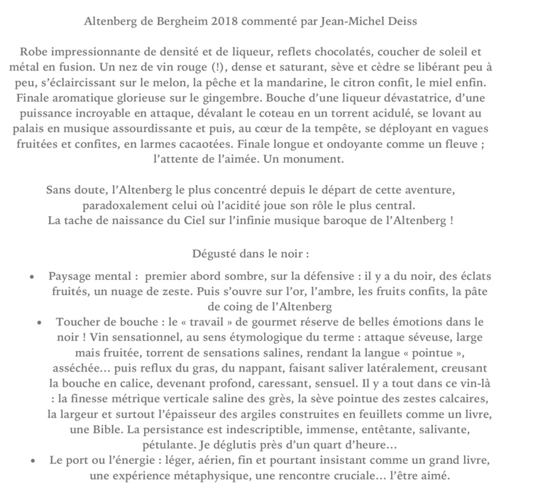 En hommage à mon amitié pour Jacques, je partage ici, comme conclusion à la lecture de son livre qui nous laisse les portes ouvertes et l’esprit libre, une image récente du vignoble de l’Altenberg, à Bergheim, où office un autre grand poète et philosophe du vin, Jean-Michel Deiss.