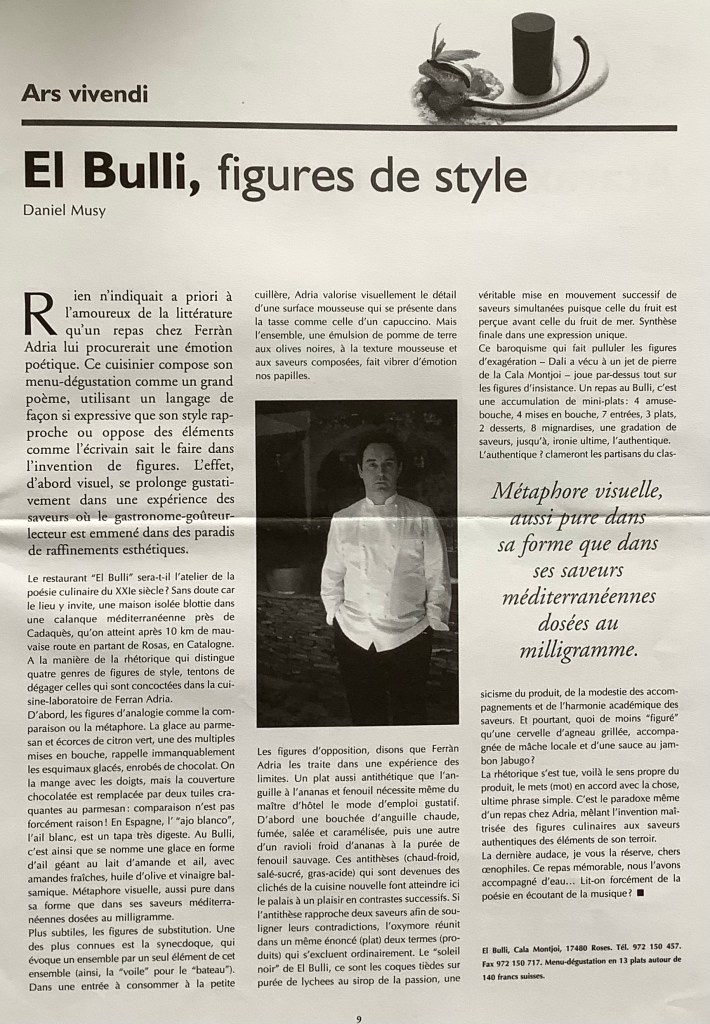 Sommes-nous loin, dans cette cuisine, des expérimentation du chef Ferrán Adria au début de notre siècle vers Cadaquès ? En 2000 justement, j’avais eu l’occasion d’écrire dans Vinifera un article pseudo-littéraire qui ne vaut peu en regard des expériences existentielles de mon ami Jacques.