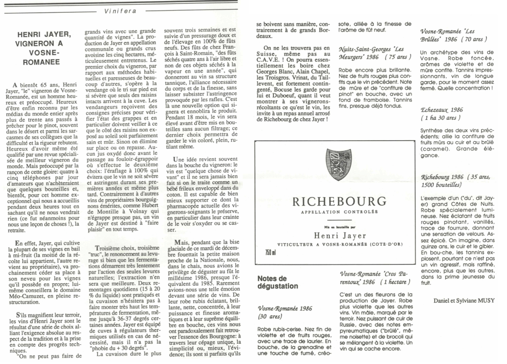 J’eus aussi la chance avec mon épouse d’être un jour glacial de décembre 1987 « l’envoyé spécial » de Vinifera dans la cave de Henri Jayer, un grand vigneron de Vosne-Romanée. Il en résulta un article aujourd’hui prémonitoire sur une certaine face de la montagne Vin : la spéculation, la fraude, l’escroquerie, la folie des grandeurs.