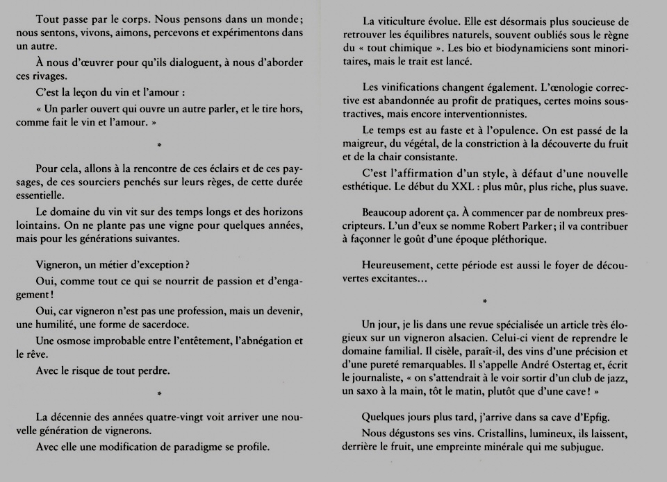 La montagne, les roches, les plis géologiques, les blocs qui se sont fissurés, font les grands vins en synergie avec un micro-climat, un ou des cépages, et la main de l’homme qui entrent mutuellement en résonance. L’ouvrage commence et se termine par des souvenirs de montagnes : le vin des glaciers de l’oncle valaisan et ce fameux bivouac sur l’Eiger.