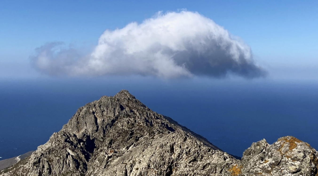 Cette image du profil Facebook de l’auteur donne la clé de son ouvrage : le mont Tziknias, le point le plus élevé de l’ile de Tinos, des vignes en bas, un nuage qui navigue au-dessus d’une mer sereine.
