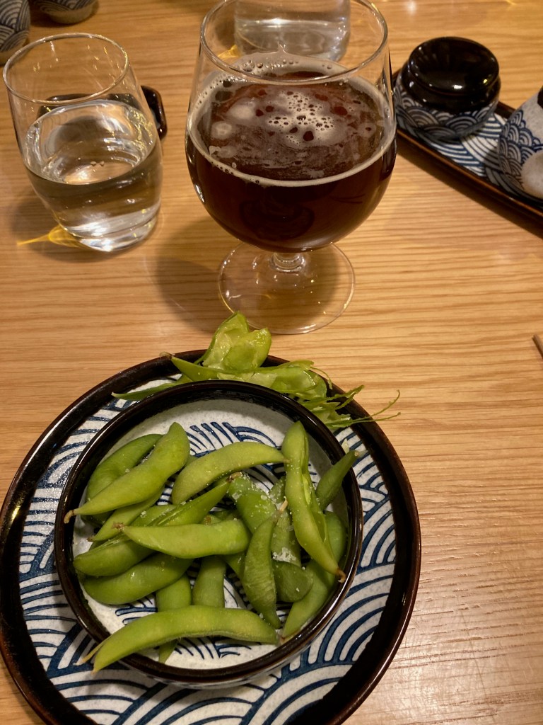 La cérémonial, en tout cas voulu comme tel par le serveur attentionné qui nous explique tout comme si nous étions ses invités, commence par une bière japonaise à la patate douce avec un edaname, des fèves fraîches de soja au gros sel dont on extrait les fruits à la main.