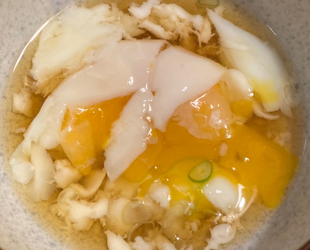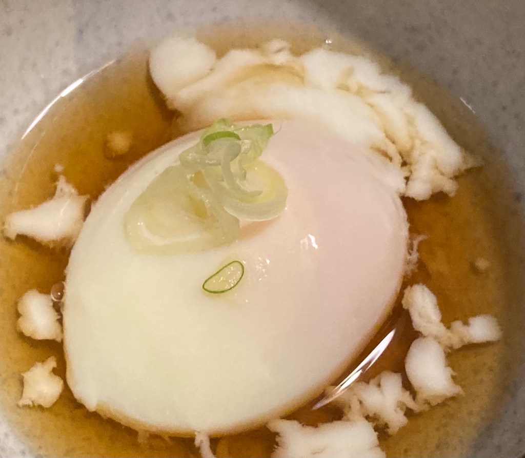 Ensuite, un oeuf minute, dans un bouillon, de poisson sauf erreur. C’est un onsen tamago, où l’œuf est coagulé dans ce liquide à basse température : le jaune est coulant et le blanc très peu cuit. Délicat.