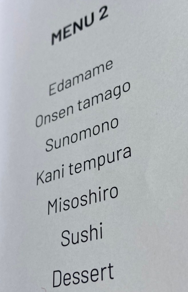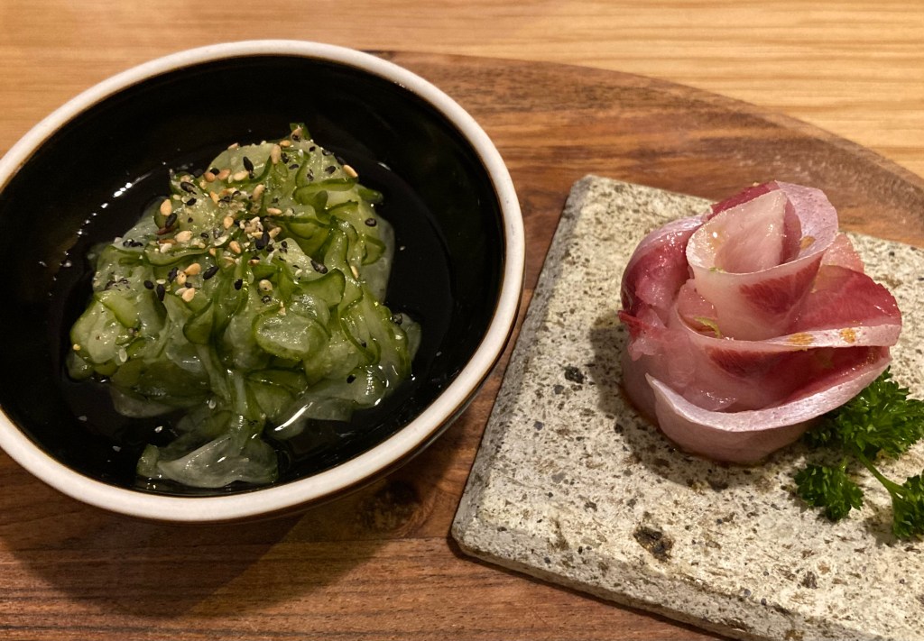 Puis un sunomono, un bol de concombres effilés légèrement vinaigrés et recouverts de sésame. À côté une fleur d’un poisson blanc cru, le hamachi, un sorte de chinchard, qu’on retrouvera dans les sushis du dernier plat : Puissant et doux.