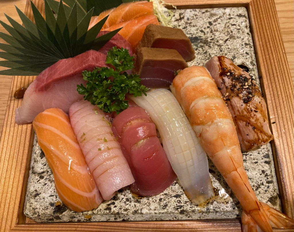 Sur un plat en marbre sont posés d’abord des nigiris, des pièces de 30 grammes (17 de poisson et 13 de riz aromatisé de différentes manières selon le poisson sous le morceau de poisson roulé) : du saumon d’Ecosse, le fameux hagachi,, du thon rouge exceptionnel, du calamar, une grosse crevette. À côté, tiède, une tranche de saumon teriyaki, cuite avec du mirin, du saké sucré. Et derrière, les même poissons crus au naturel, des sashimis, avec en plus du thon snacké, en foncé sur l’image.