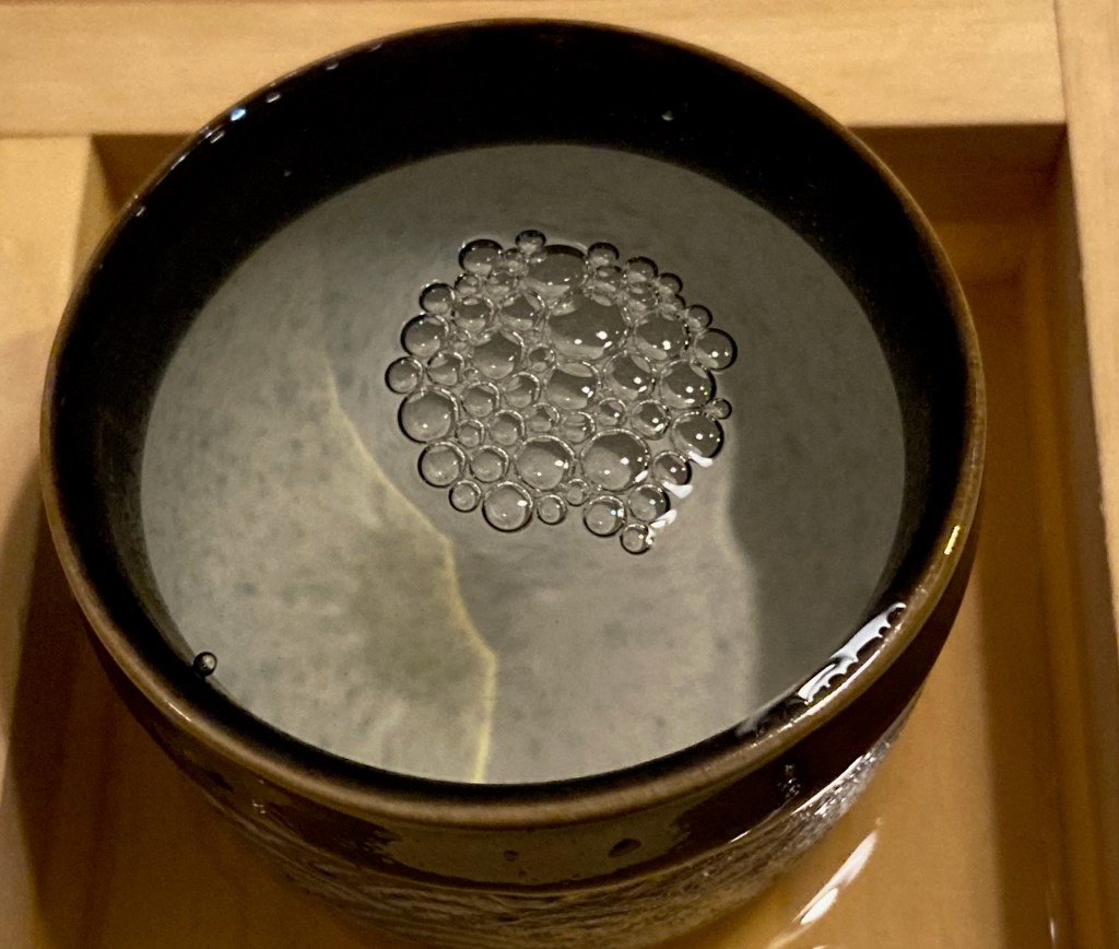 Avant les poissons crus j’ai commandé un petit verre de saké, l’alcool de riz à 16 degrés. Il a été servi débordant avec un surplus se déversant dans un petit caisson en bois d’eucalyptus, surplus qu’on boira par la suite. Revigorant.