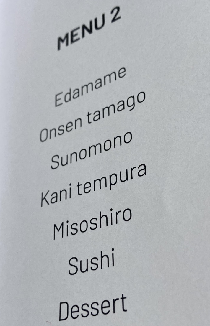 Puis un sunomono, un bol de concombres effilés légèrement vinaigrés et recouverts de sésame. À côté une fleur d’un poisson blanc cru, le hamachi, un sorte de chinchard, qu’on retrouvera dans les sushis du dernier plat : Puissant et doux.