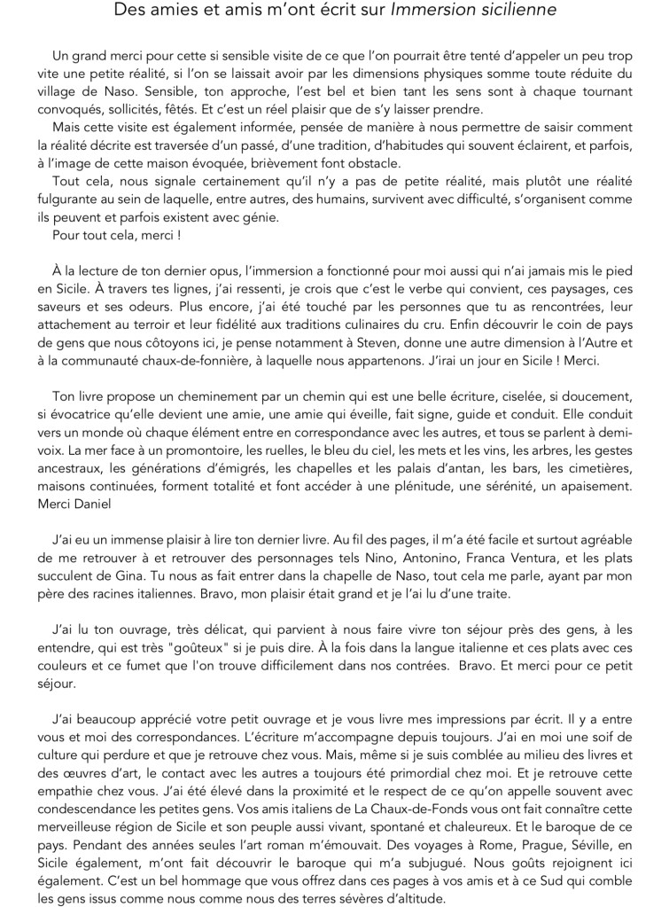 En mai 2024, j’ai passé dix jours à Naso, un village du nord de la Sicile, en face des îles éoliennes. Après ce séjour mémorable et émouvant, j’ai écrit un petit ouvrage de 80 pages, une sorte de carnet de séjour en huit chapitres, accompagné d’une soixantaine d’images originales. Il sortira en librairie fin février 2025 et peut jusque-là m’être commandé en souscription ou être gratuitement téléchargé.